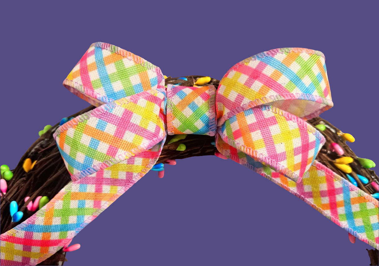 This little bunny is ready to steal the show this Easter! His little cotton tail rests in a bed of Easter eggs, surrounded by pastel sprigs. A bright and colorful plaid bow sits off-center atop the berry-covered crescent frame. Let him bring a smile to your face this spring!