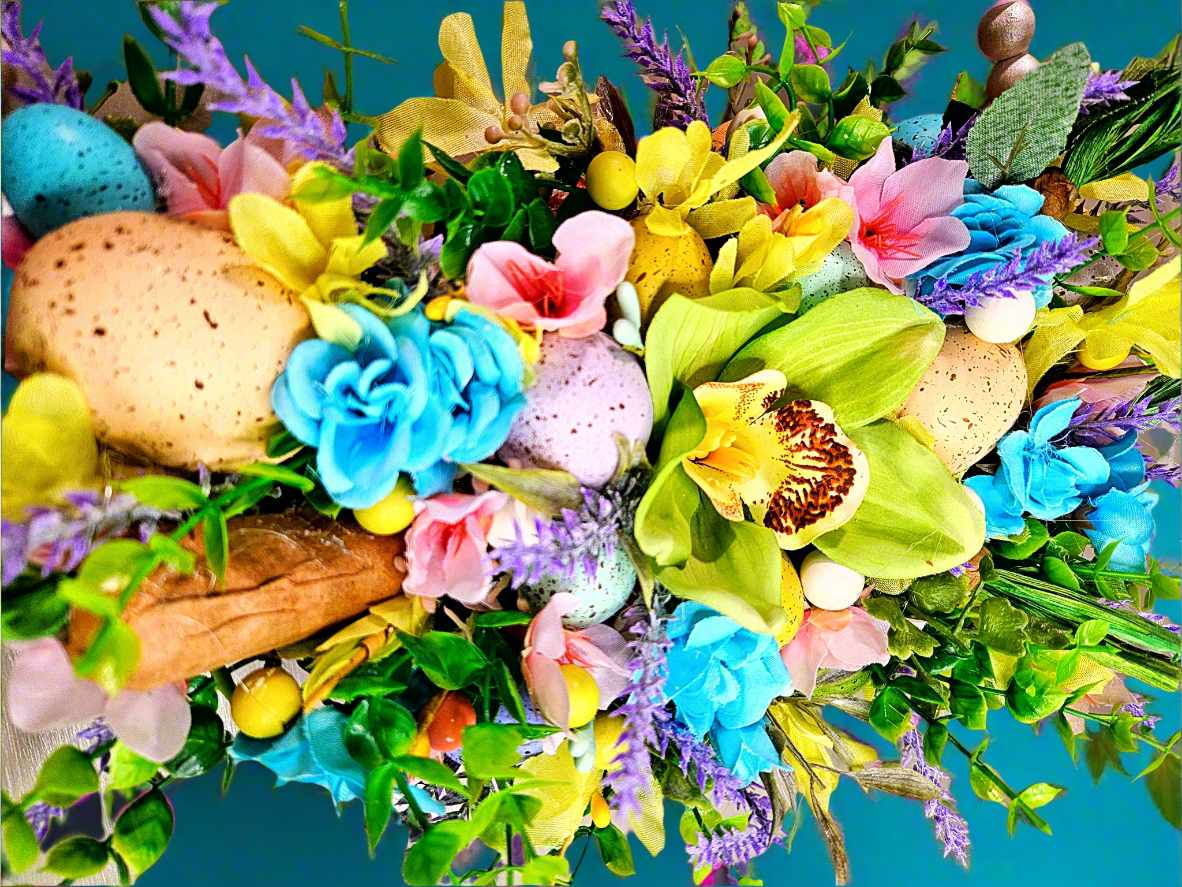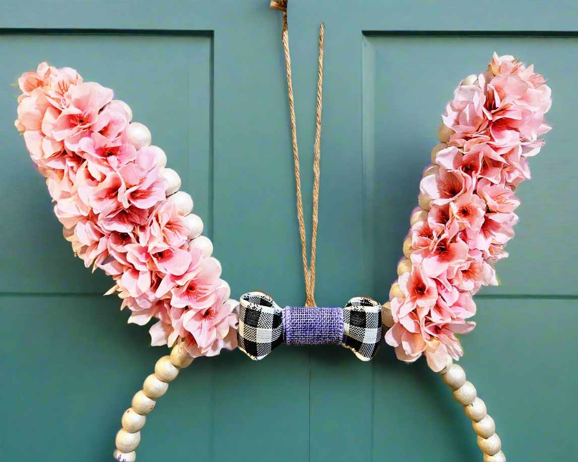 This sweet bunny is looking for someone to love her! Wooden beads, hand-painted with pearlescent shimmer, make up the frame of this wreath. Two pink, cherry-blossom ears sit on top, while a basket-full of brightly-colored eggs and flowers adorn the bottom. A sweet little burlap bow between the ears completes the ensemble!
