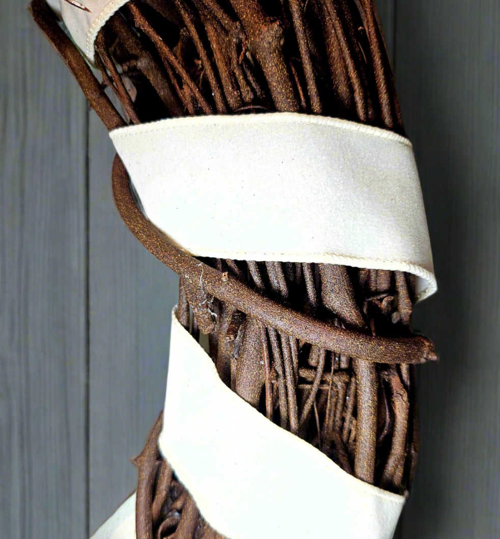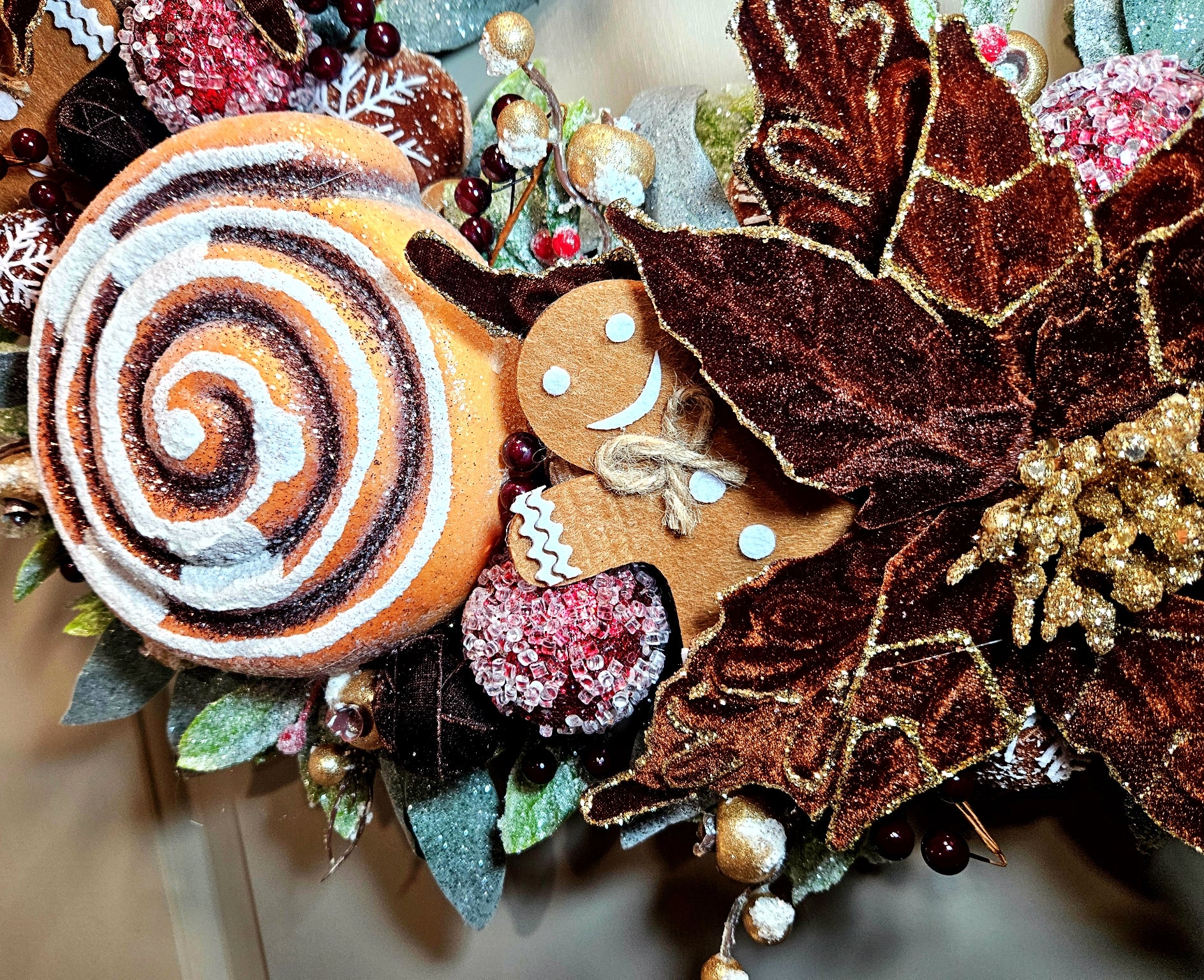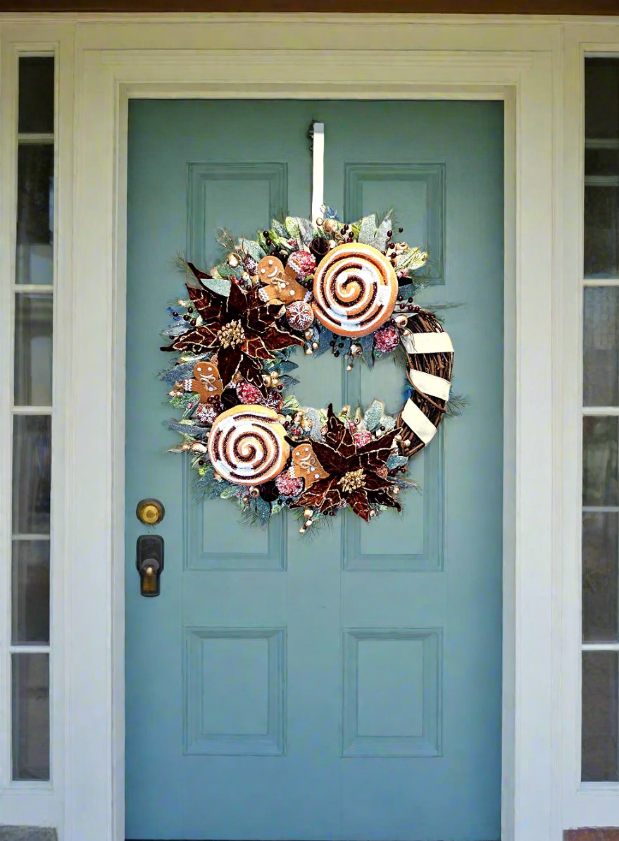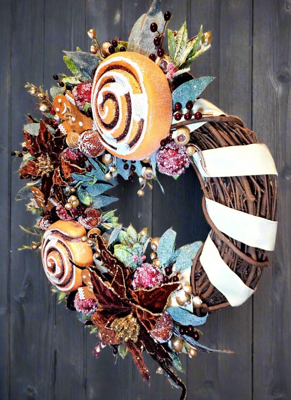 Mix it up this Christmas with this unique and whimsical Cinnamon Wreath! A chocolate-brown frame serves as the base for two jumbo-sized Cinnamon Rolls, and two velvet brown poinsettias blossoms. Felt gingerbread men, and snowflake-embellished gingerbread balls peek out from between the buns, while Holly leaves and berries add color contrast and fullness. Frosted golden berries also add a luscious shine. A buttercream frosting ribbon swirls around the chocolate frame to complete the look.