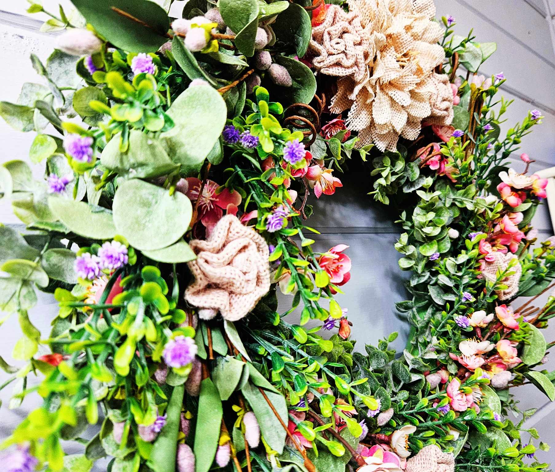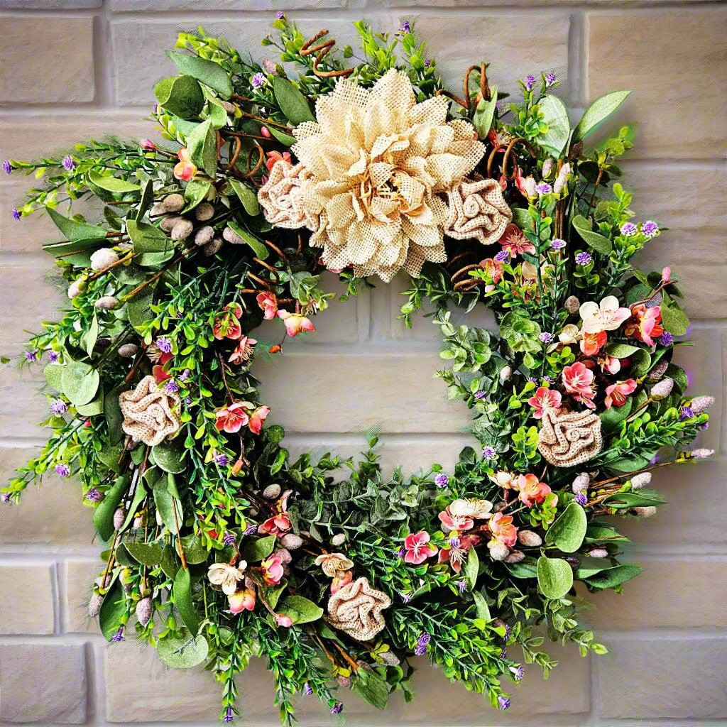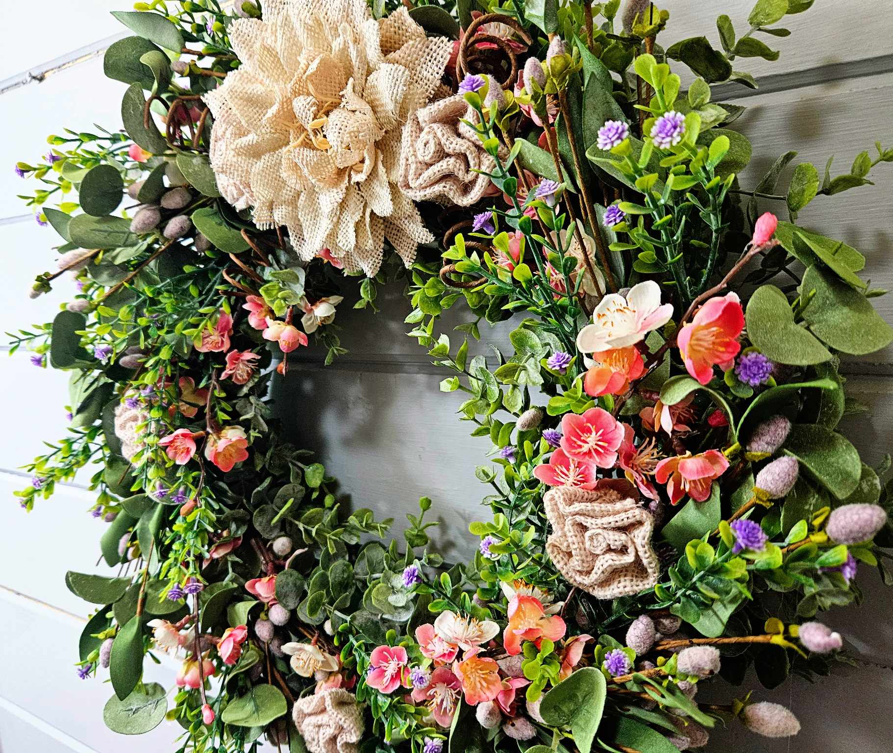 This lush wreath boasts a eucalyptus base, with accents of cherry blossom and lavender, and is enhanced by a series of burlap bows. A great addition to your Valentine's decor, or combine it with other pastels to welcome in the Springtime.