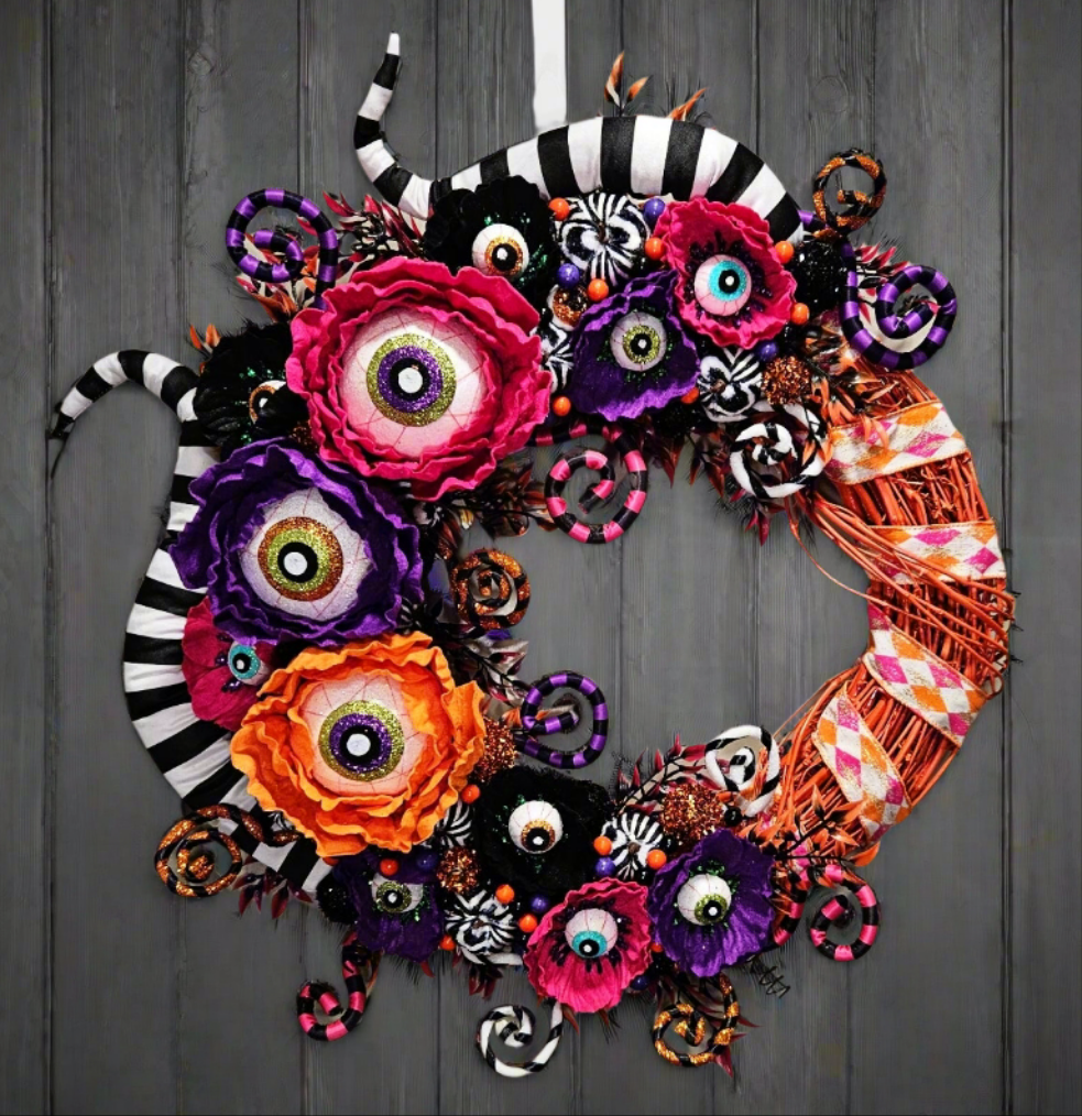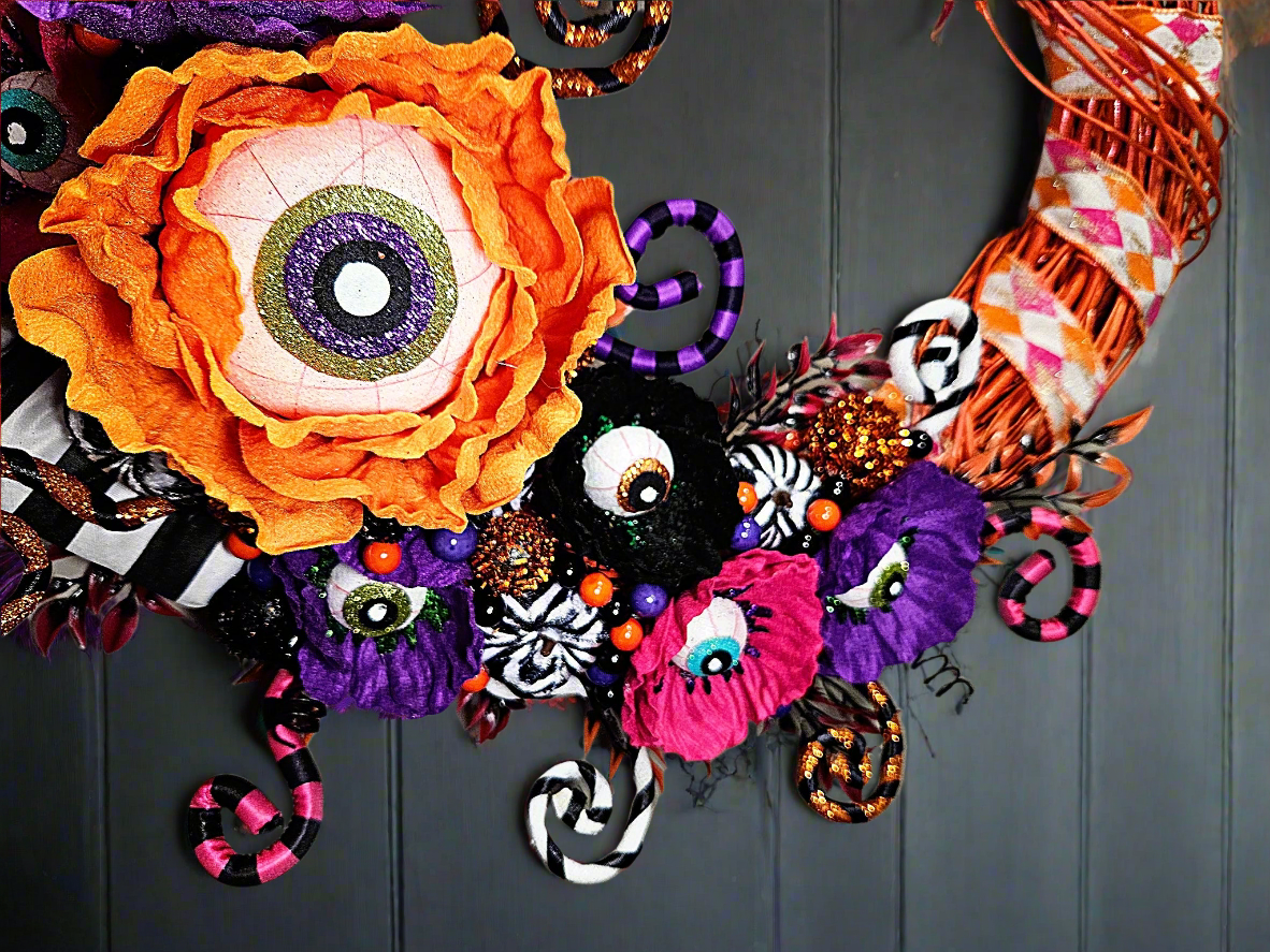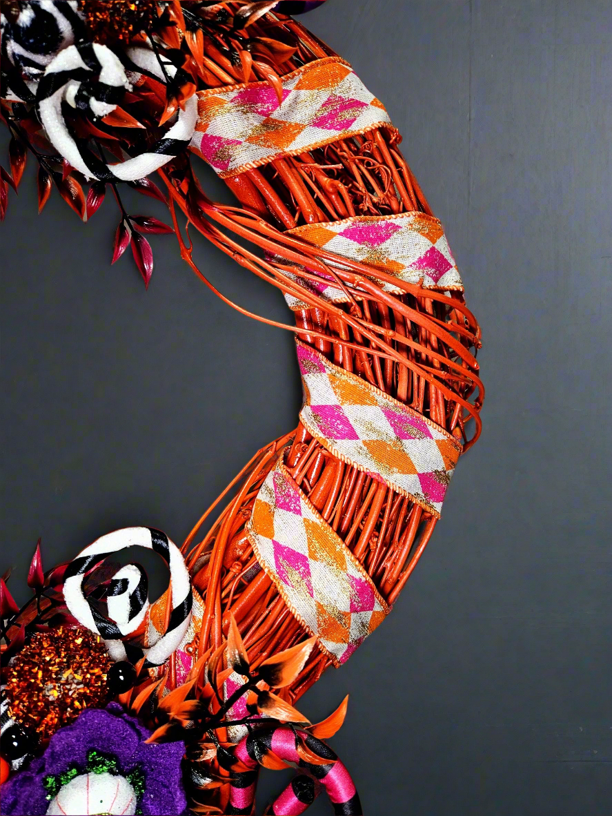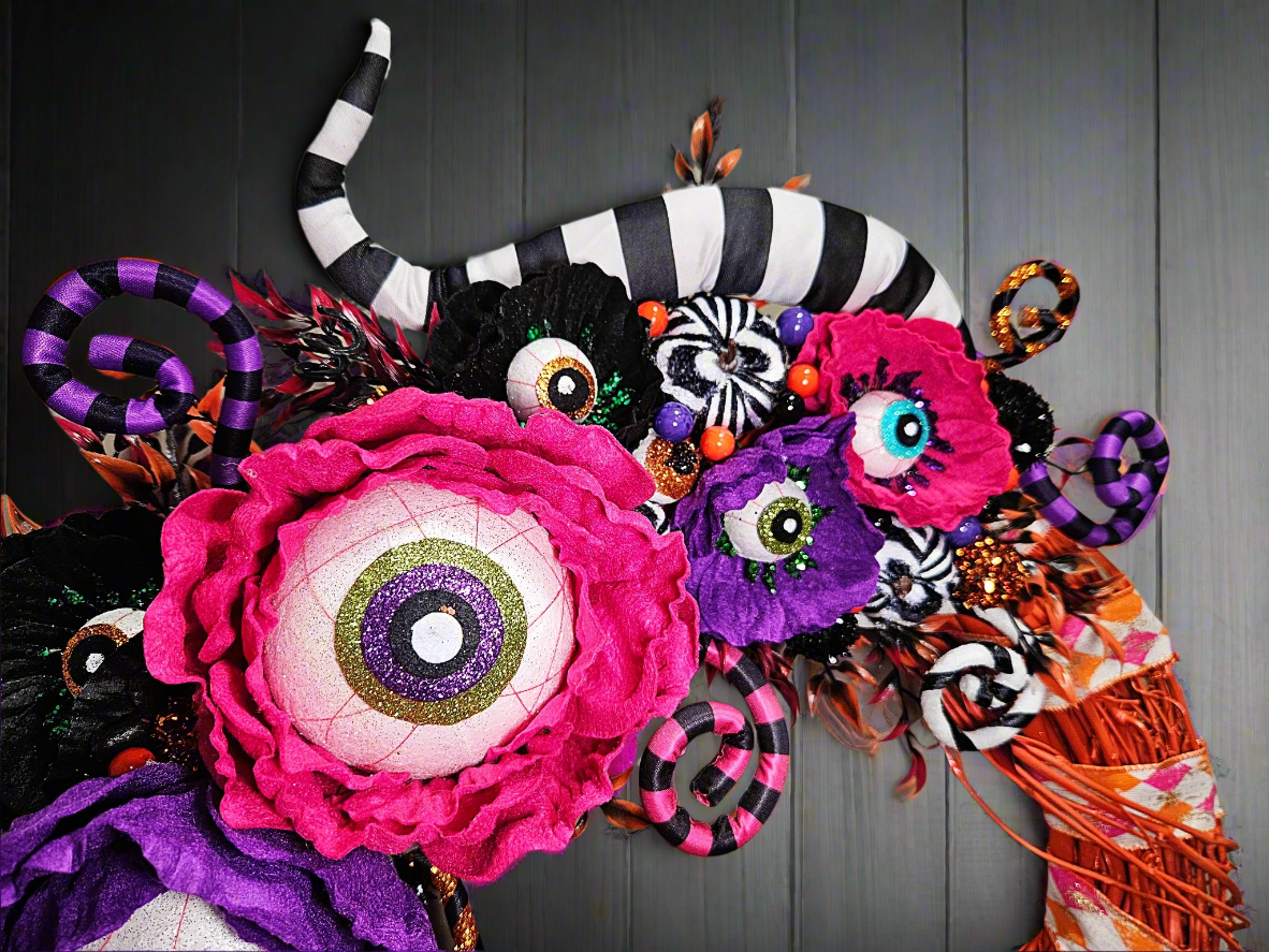 This wreath is a real looker! Three giant eyeball flowers peek out at you from one side, while a plethora of smaller eyeball flowers, in bold pink, orange, purple, and black colors, continue outward along the frame. Giant black and white monster horns protrude from the top and bottom of the wreath, and travel along the sides. A beautiful orange and pink harlequin ribbon, with flecks of gold, spirals around the exposed frame. The frame itself boasts a liquid-like orange paint, which shimmers with pink pearlescence.