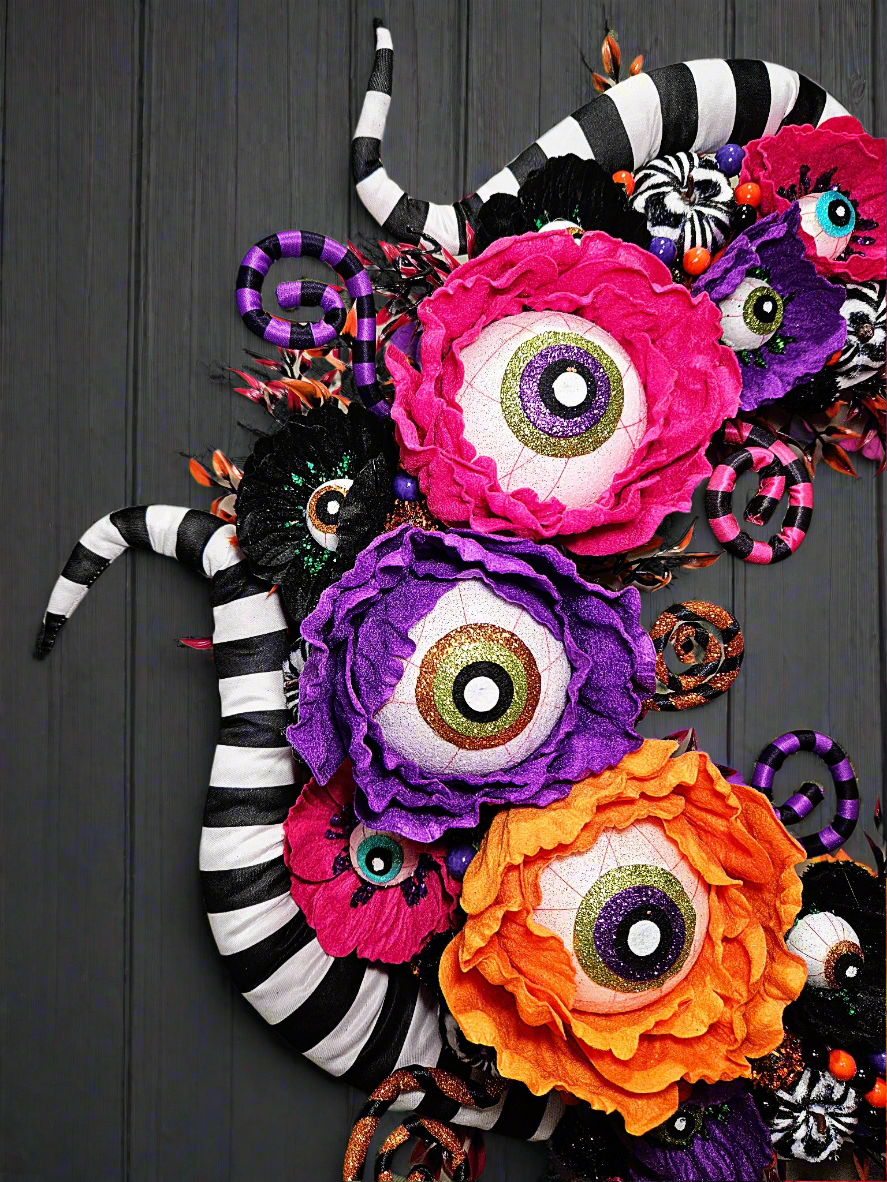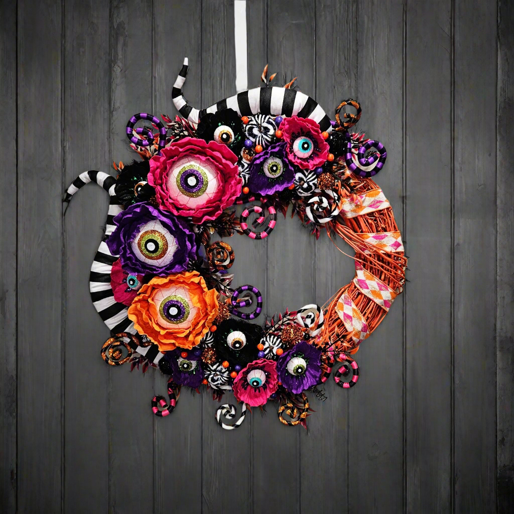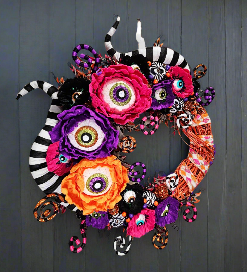 This wreath is a real looker! Three giant eyeball flowers peek out at you from one side, while a plethora of smaller eyeball flowers, in bold pink, orange, purple, and black colors, continue outward along the frame. Giant black and white monster horns protrude from the top and bottom of the wreath, and travel along the sides. A beautiful orange and pink harlequin ribbon, with flecks of gold, spirals around the exposed frame. The frame itself boasts a liquid-like orange paint, which shimmers with pink pearlescence.