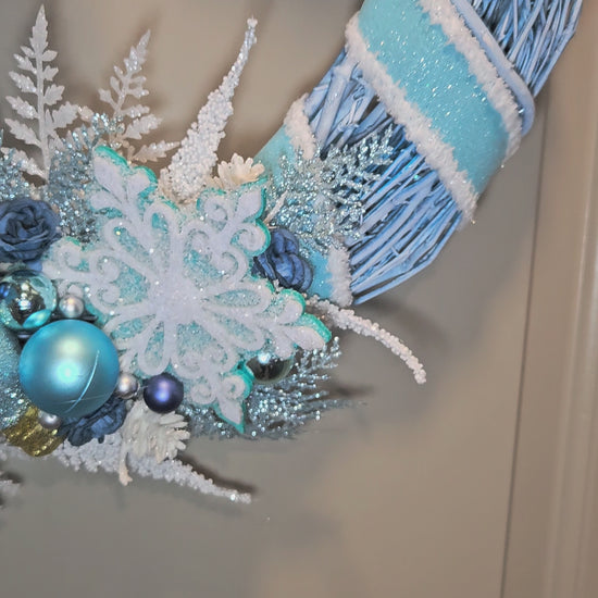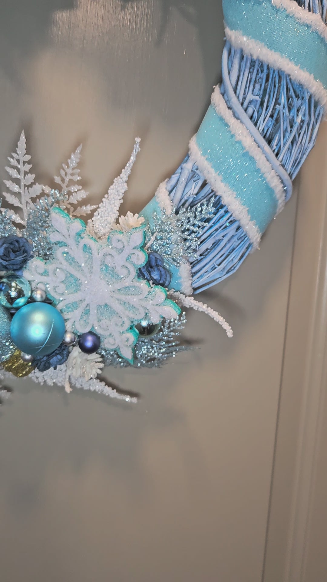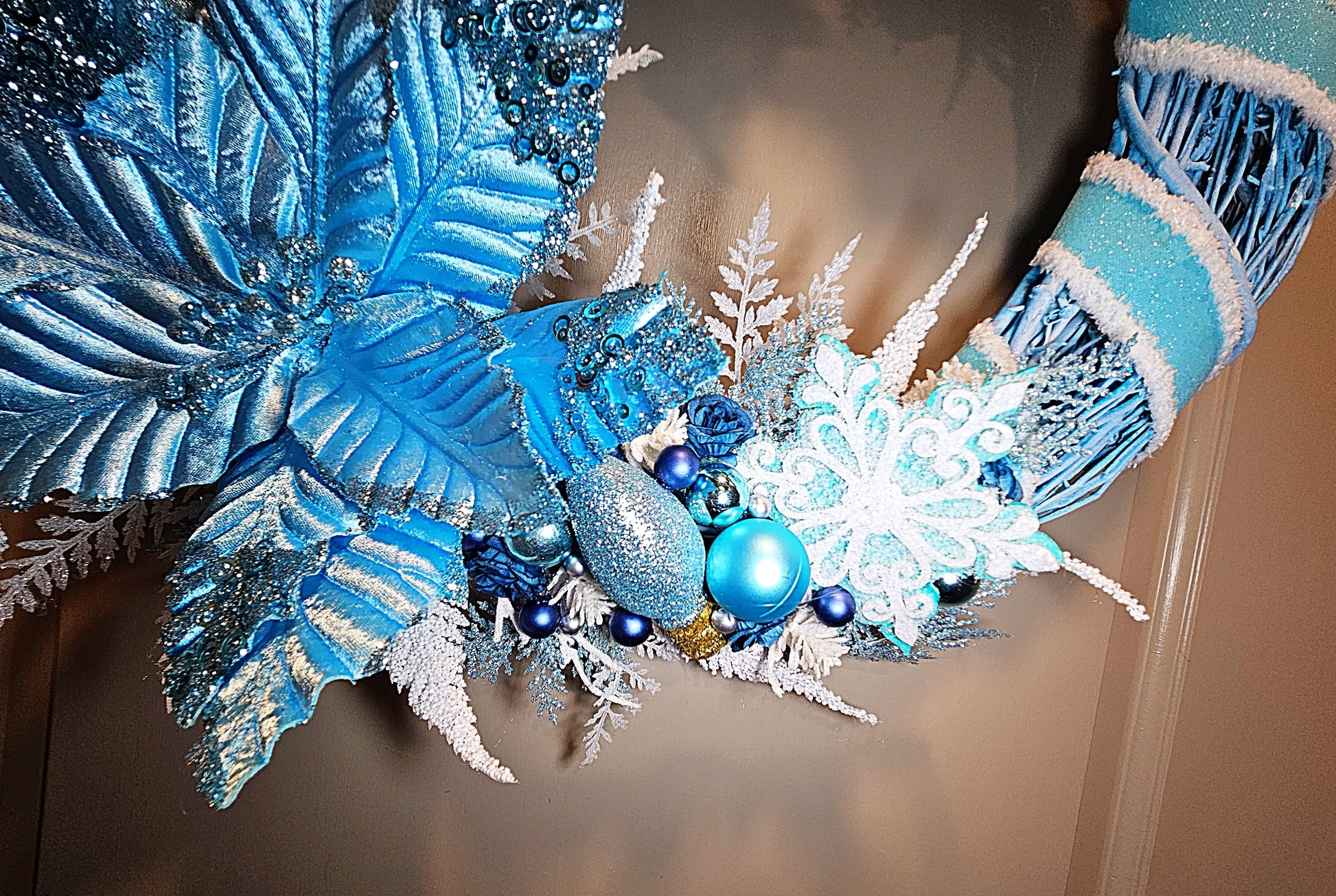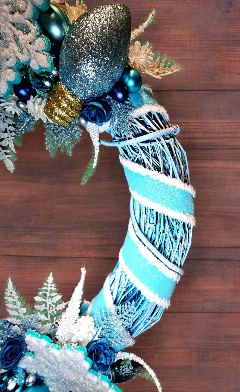 Let this wreath take your decor past the holidays and through the Winter, with its stunning tones of blue and silver. Two stately ice poinsettias are surrounded by a cornucopia of jumbo Christmas light bulbs, over-sized snowflakes, ornaments, frosted pine cones, and blue Winter flowers. The icy grapevine frame is wrapped in a blue, spiraling, snow-trimmed ribbon.