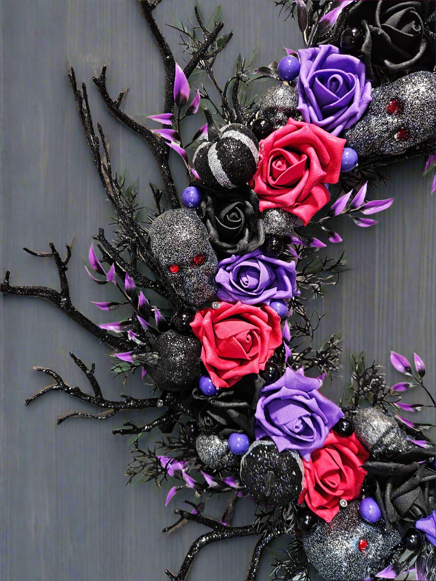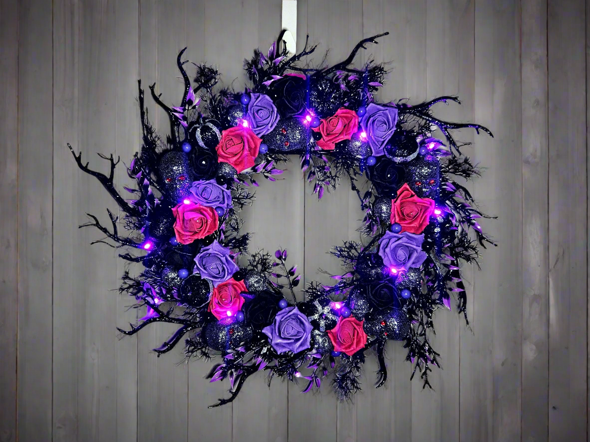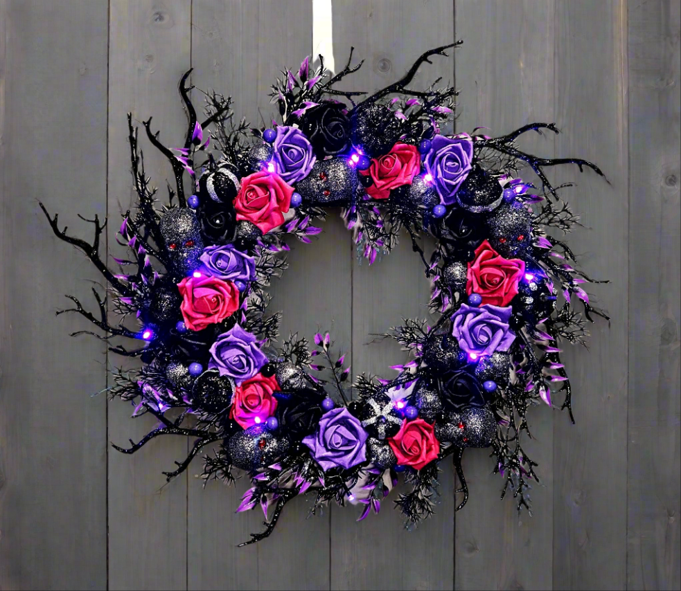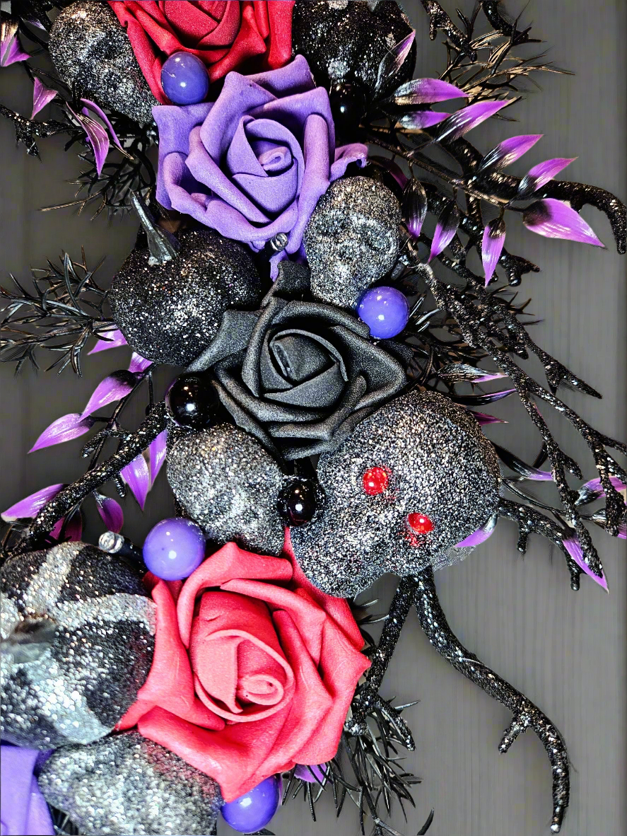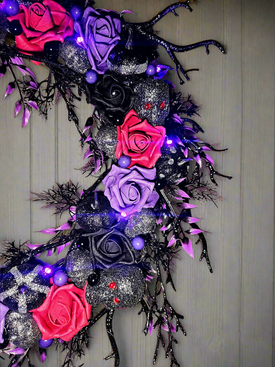 Looking for the perfect elegant, yet Gothic door decor this spooky season? Look no further! This romantic beauty positively glows with purple LED lighting (x2 AA batteries)! A creepy, black, glittery twig frame serves as the base. Matte red, purple, and black roses line the circumference, surrounded by gray sparkling skulls. Small shiny berries in black and purple add a textural contrast, while purple and black sprigs complete the look.