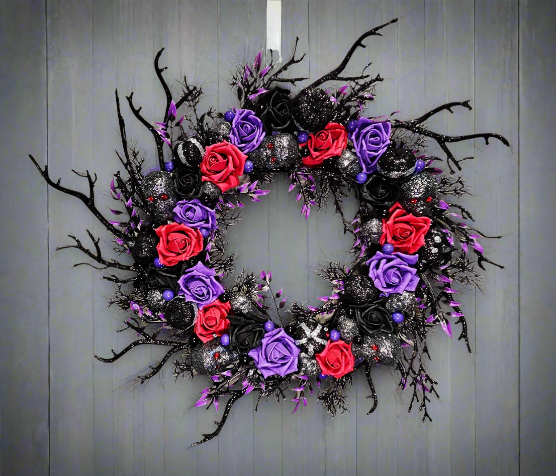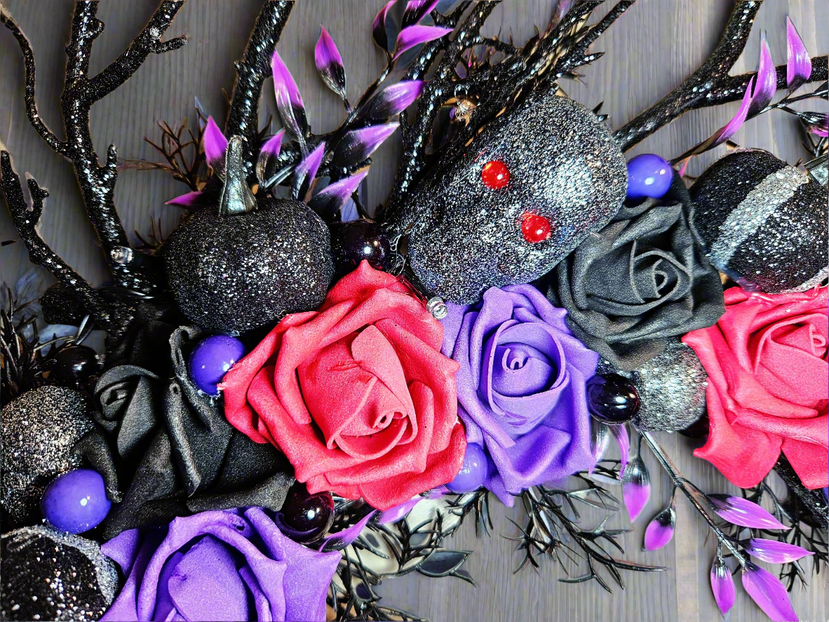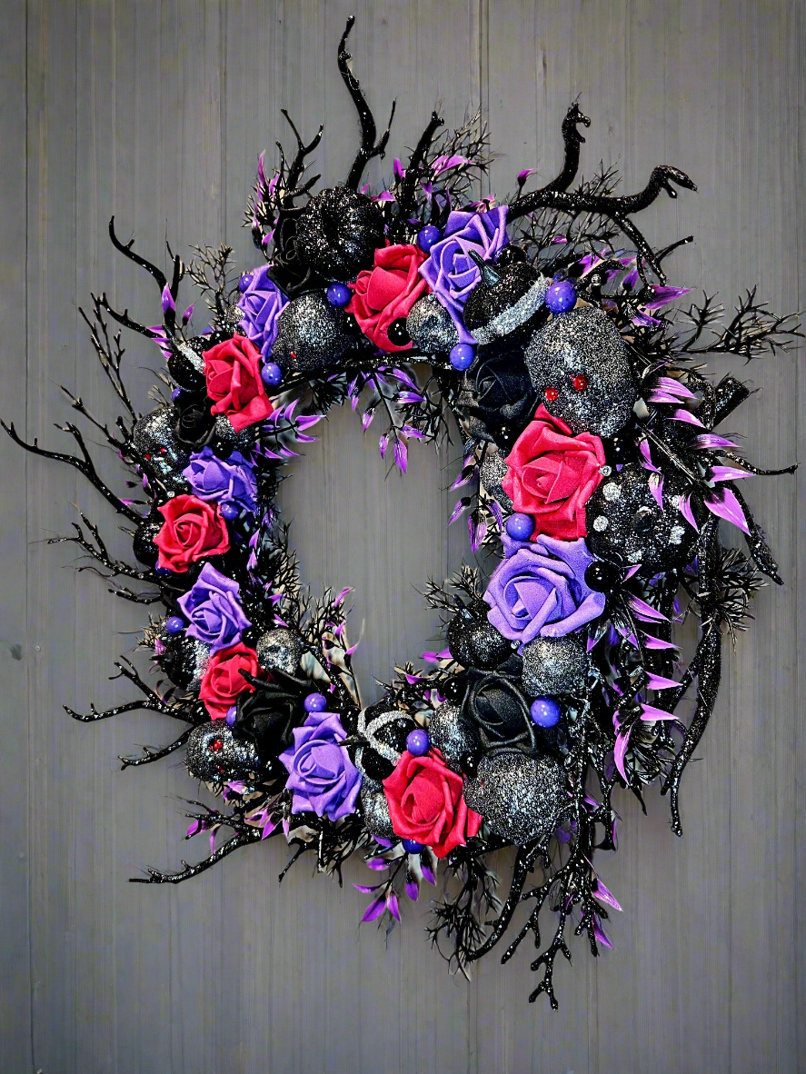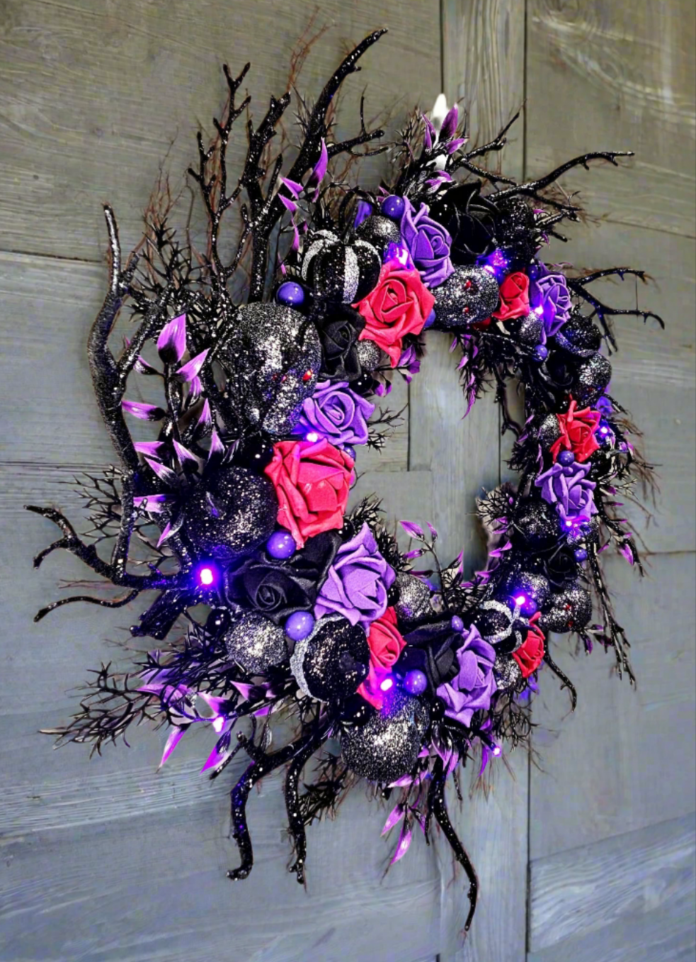 Looking for the perfect elegant, yet Gothic door decor this spooky season? Look no further! This romantic beauty positively glows with purple LED lighting (x2 AA batteries)! A creepy, black, glittery twig frame serves as the base. Matte red, purple, and black roses line the circumference, surrounded by gray sparkling skulls. Small shiny berries in black and purple add a textural contrast, while purple and black sprigs complete the look.