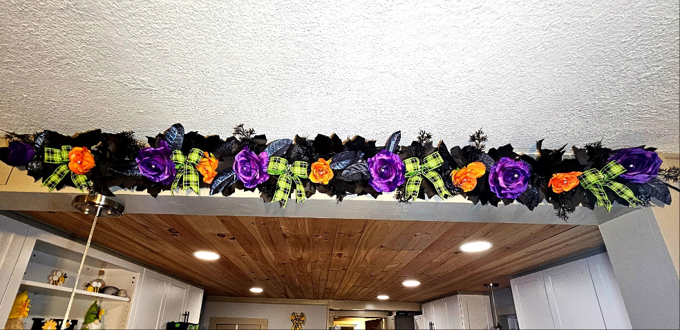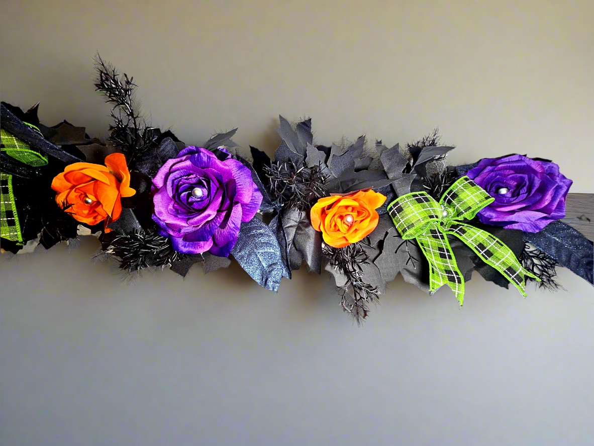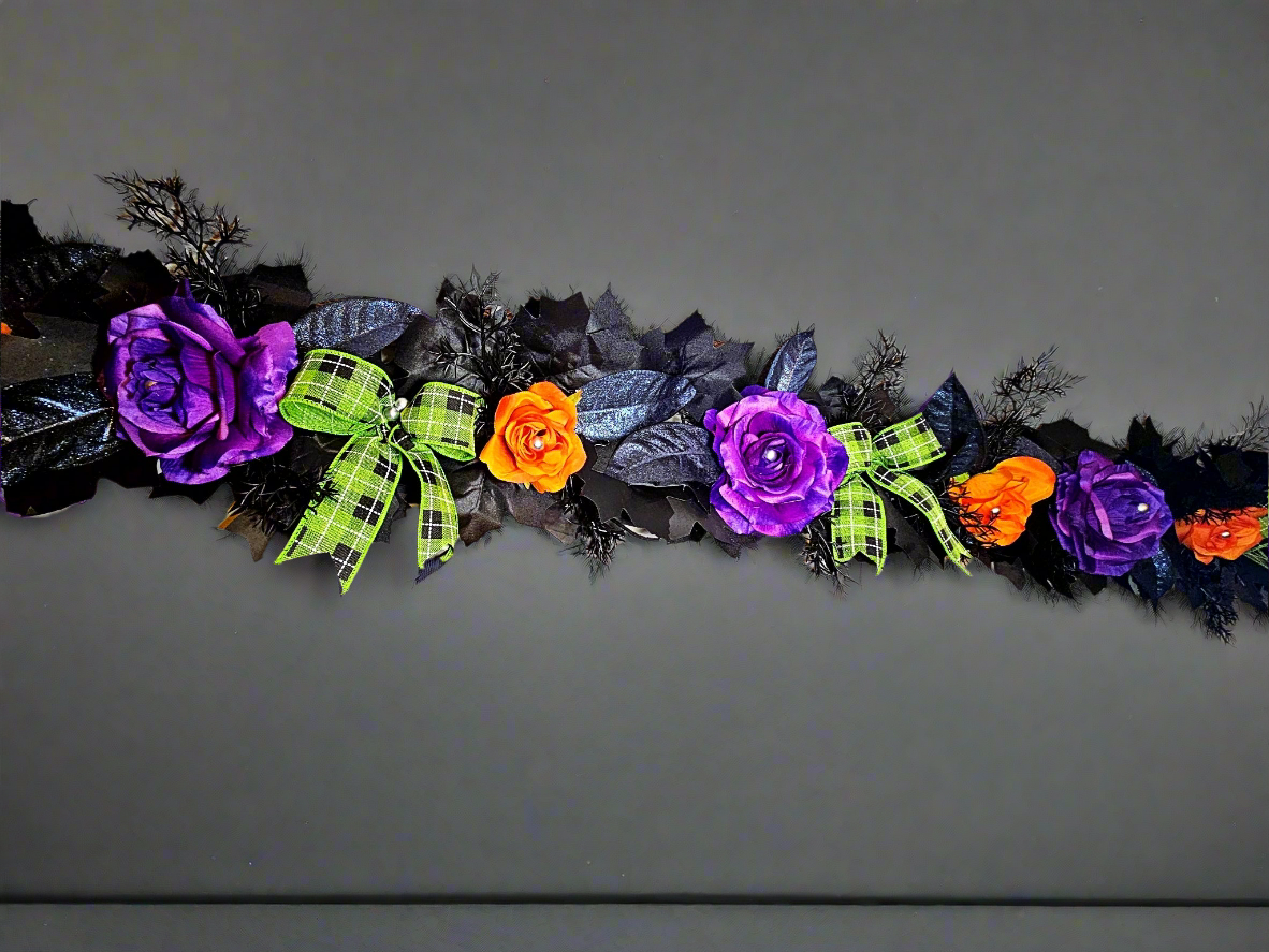 This garland will be a new staple for your annual Halloween decor! Black maple leaves serve as the background to contrasting classic Halloween colors. Bold purple and orange flowers, and bright green plaid bows catch the eye, while shimmery dark bay leaves create subtle interest among the maple leaves. Small silver pearls lay at the center of each flower and bow to complete the look.