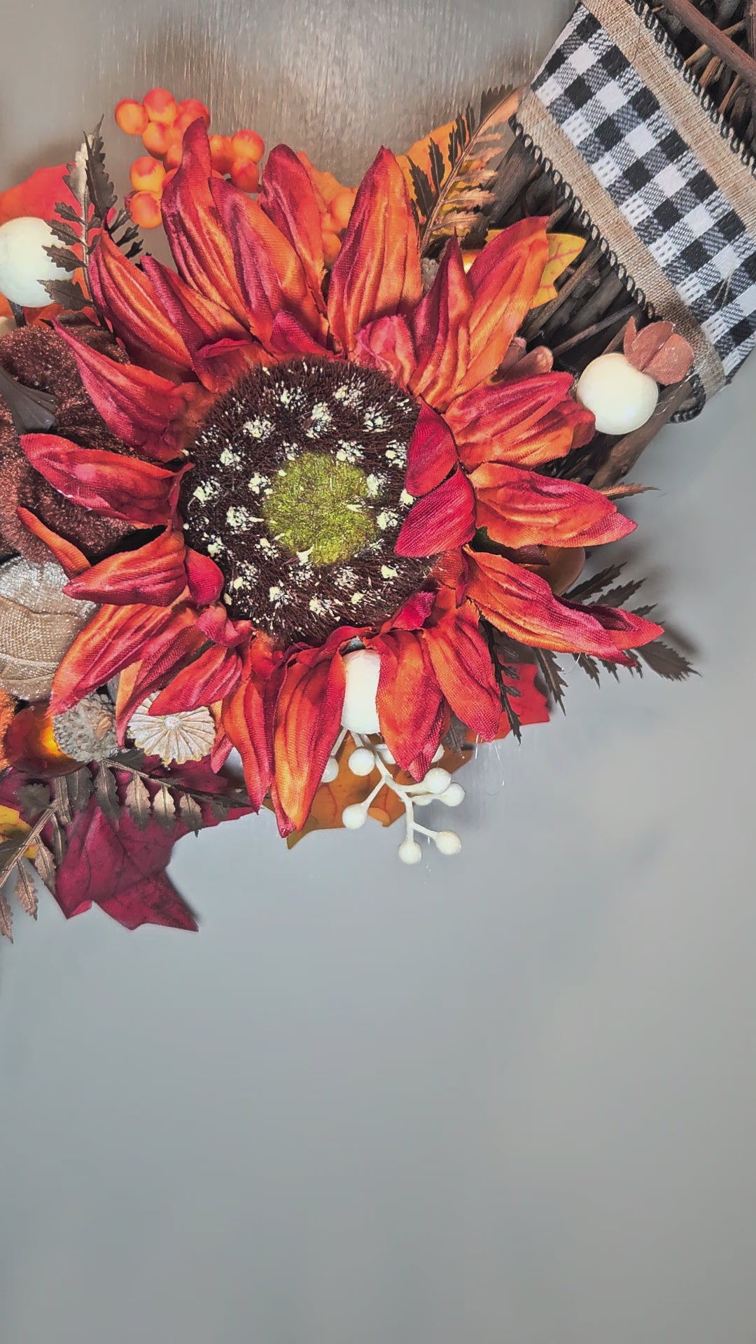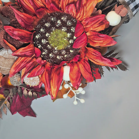 A classic Harvest favorite, this stunning wreath boasts five large sunflowers, spanning the left side of the frame. Three of a rustic orange color, and two a bold merlot, with gold beaded centers that catch the light on a sunny day. Small flocked pumpkins of assorted tones rest snugly between the flowers. On the opposing side, a burlap buffalo plaid ribbon adds a classic farmhouse vibe to complete the look