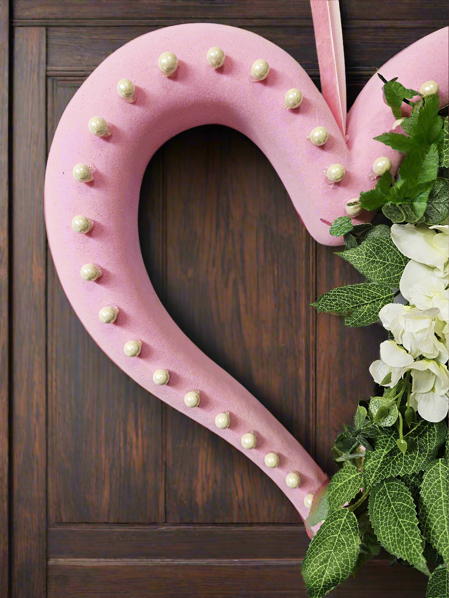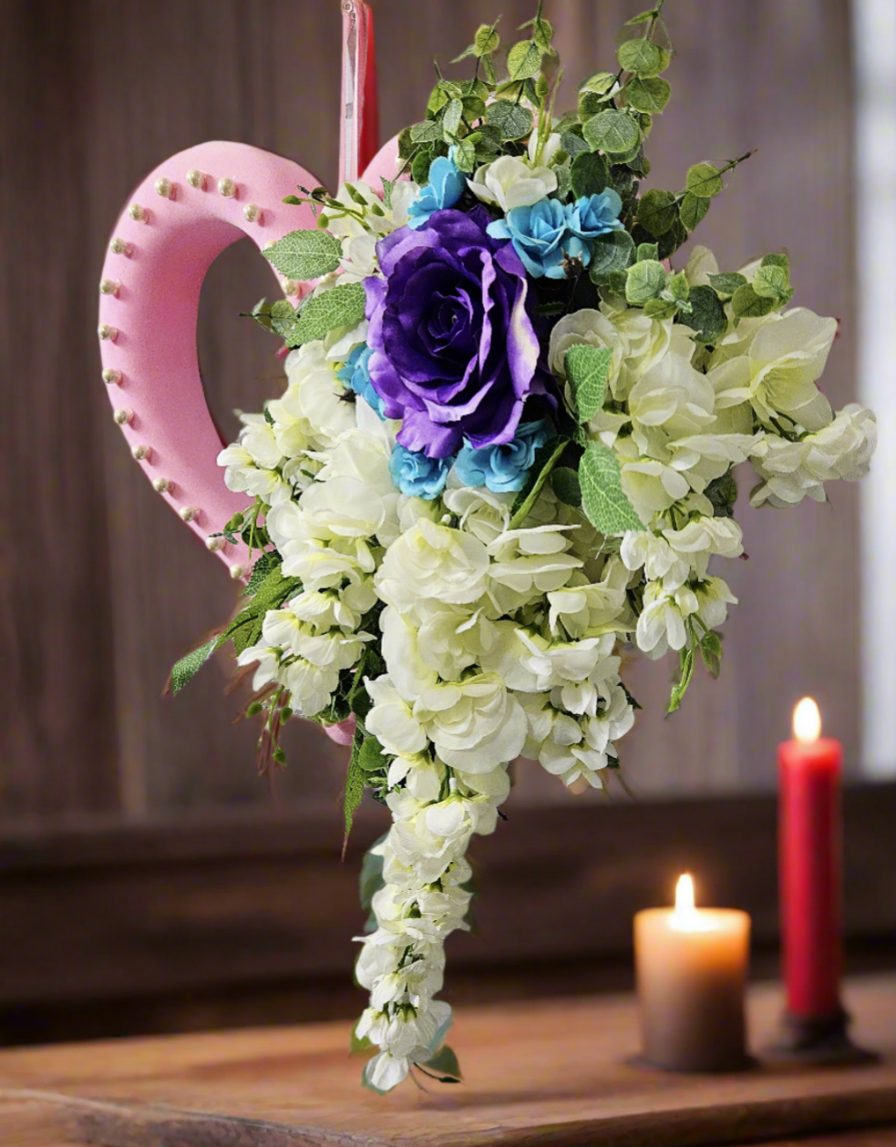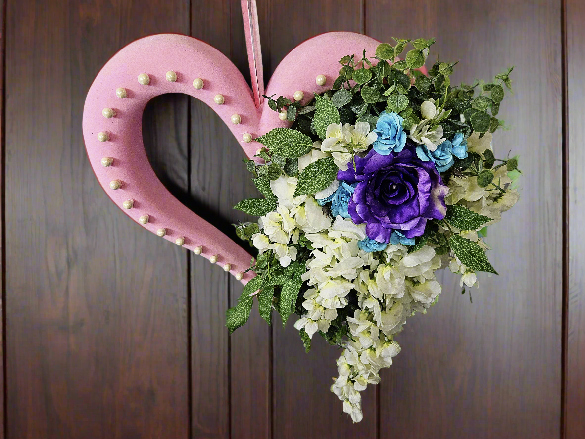 This luscious heart is just waiting for the perfect relationship to let her shine! A large purple rose, accented by hints of baby blue, commands a dramatic cascade of white flowers, while pearl beads line the soft pink exposed heart frame. The perfect accent to any wedding or anniversary party, or the perfect drama for your front door!