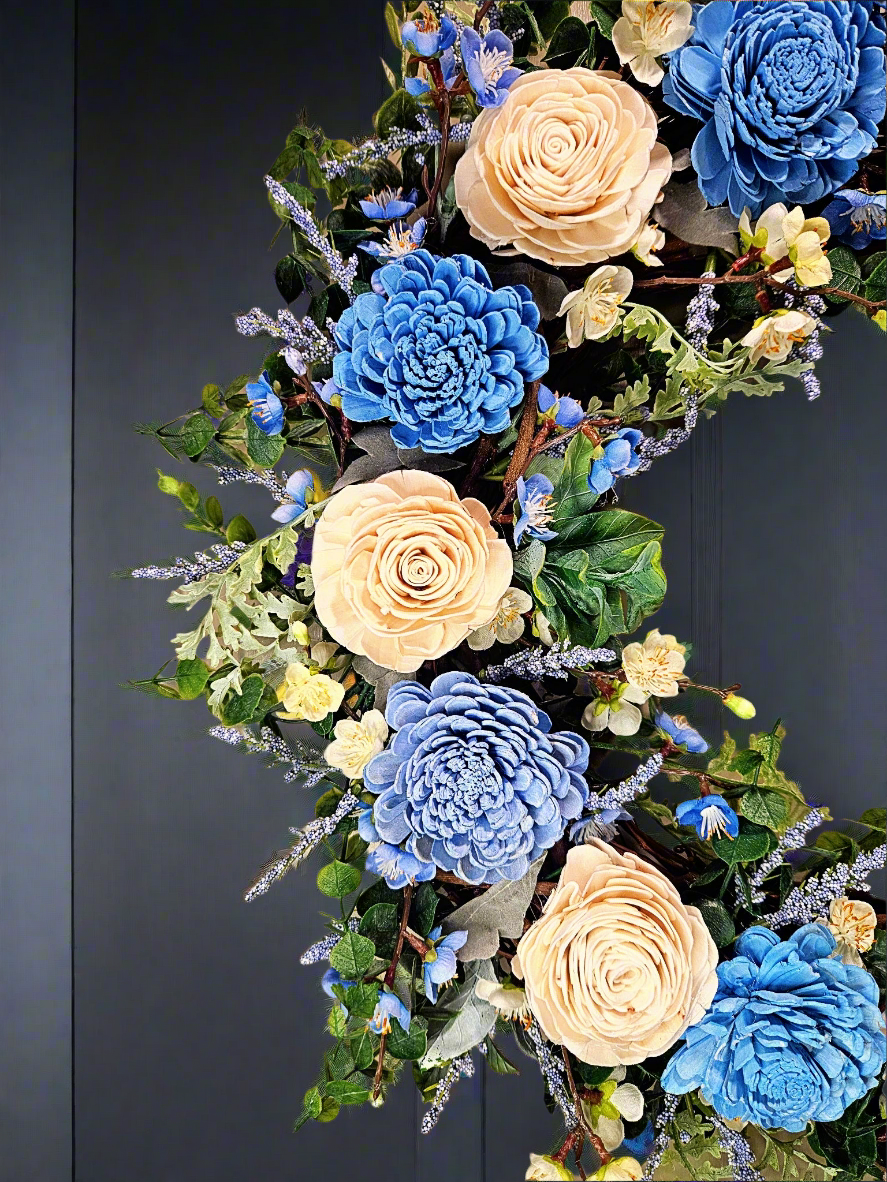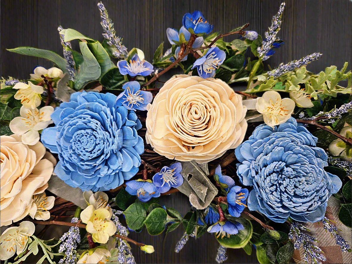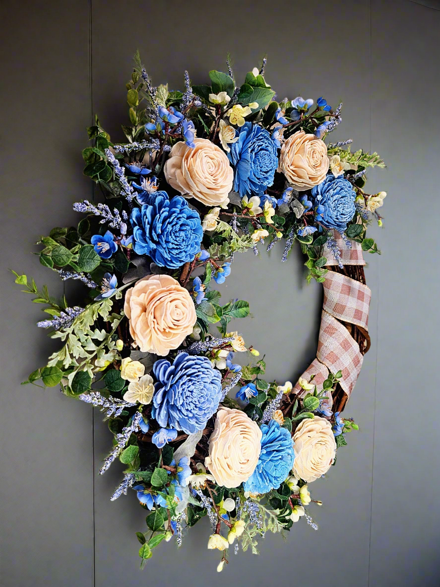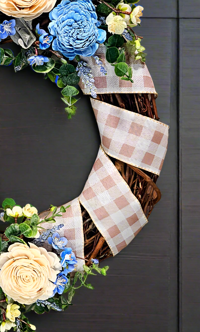 An understated beauty, this wreath features baby blue and cream colored paper flowers. Cherry blossoms of matching colors enhance the delicate feel, stemming from a bed of muted mixed greens. A tan and white buffalo plaid ribbon adorns the right side, completing the look.