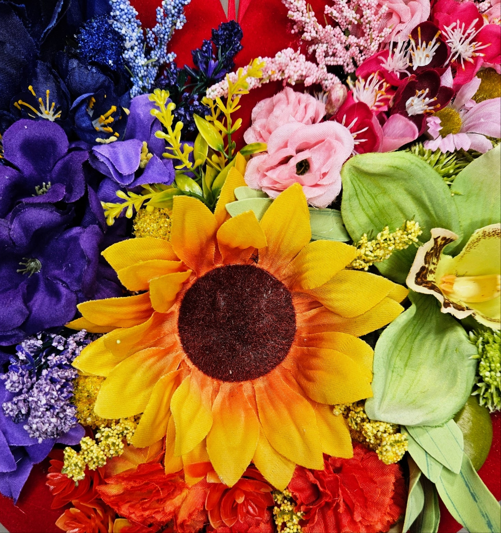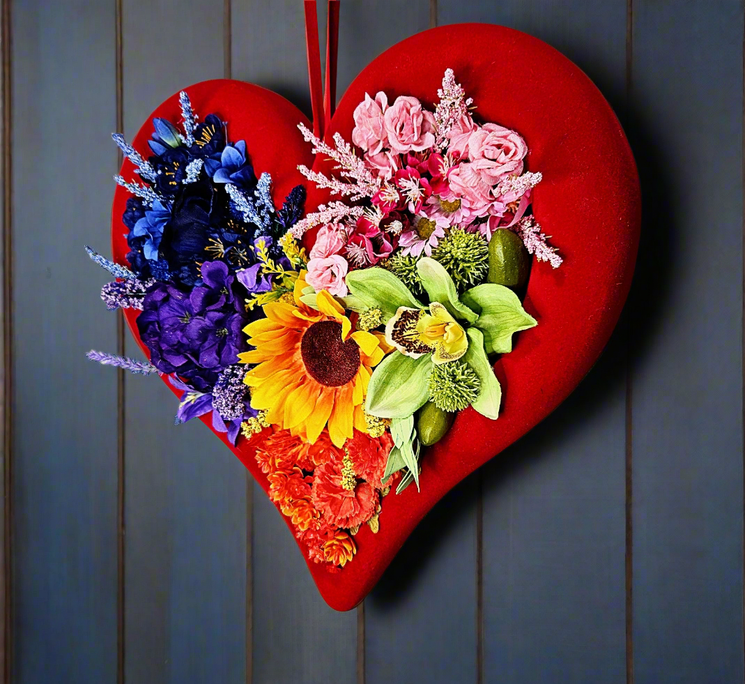 Celebrate love, in every shape and form, with this bold and vibrant wreath! It's flocked red heart frame embraces all the colors of the rainbow, each one composed of unique and eye-catching components. Together, they are far more beautiful than each one alone.