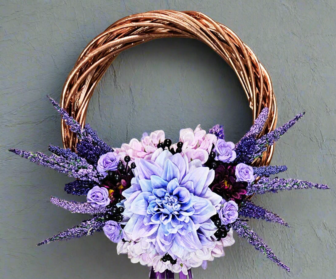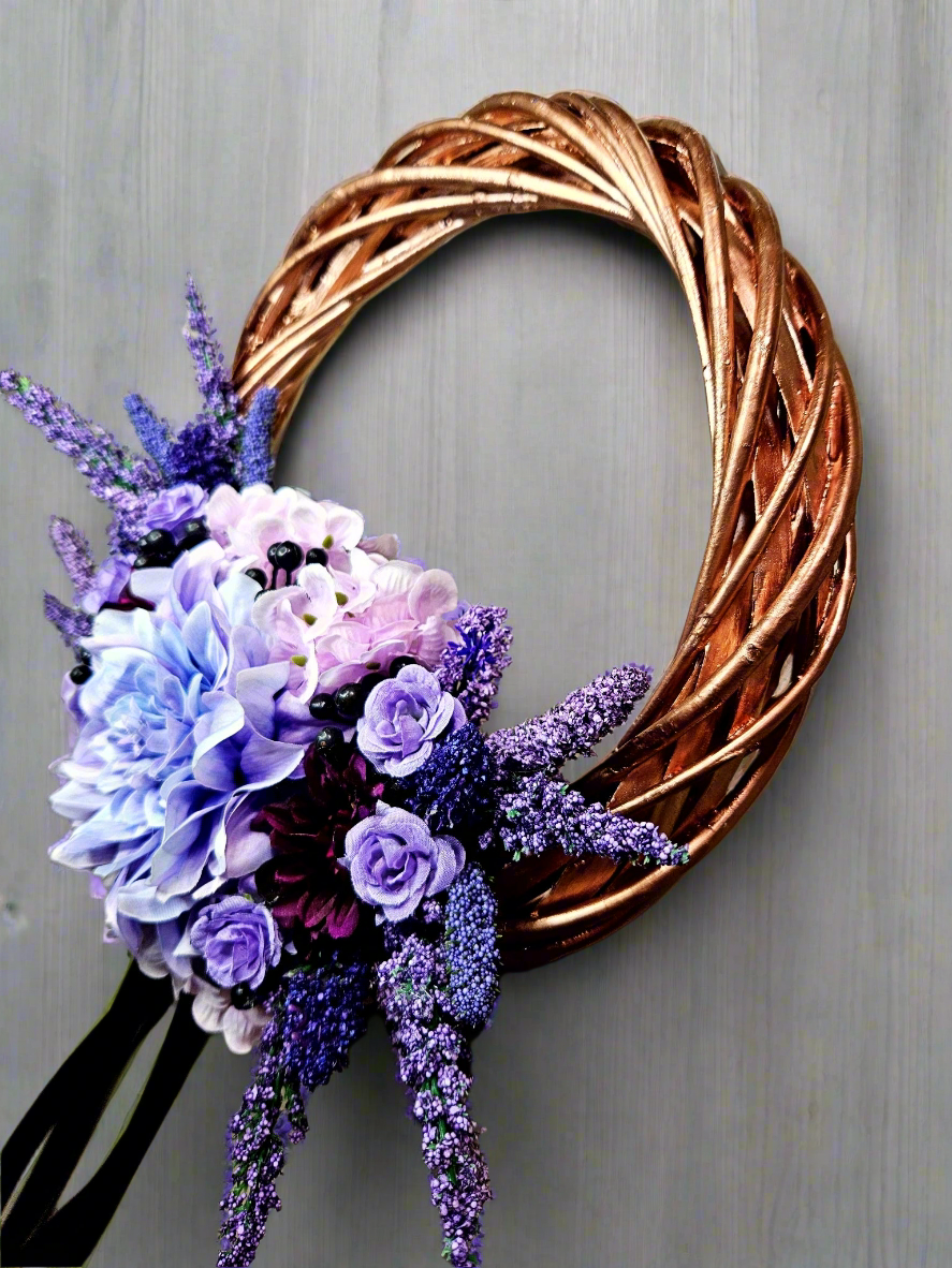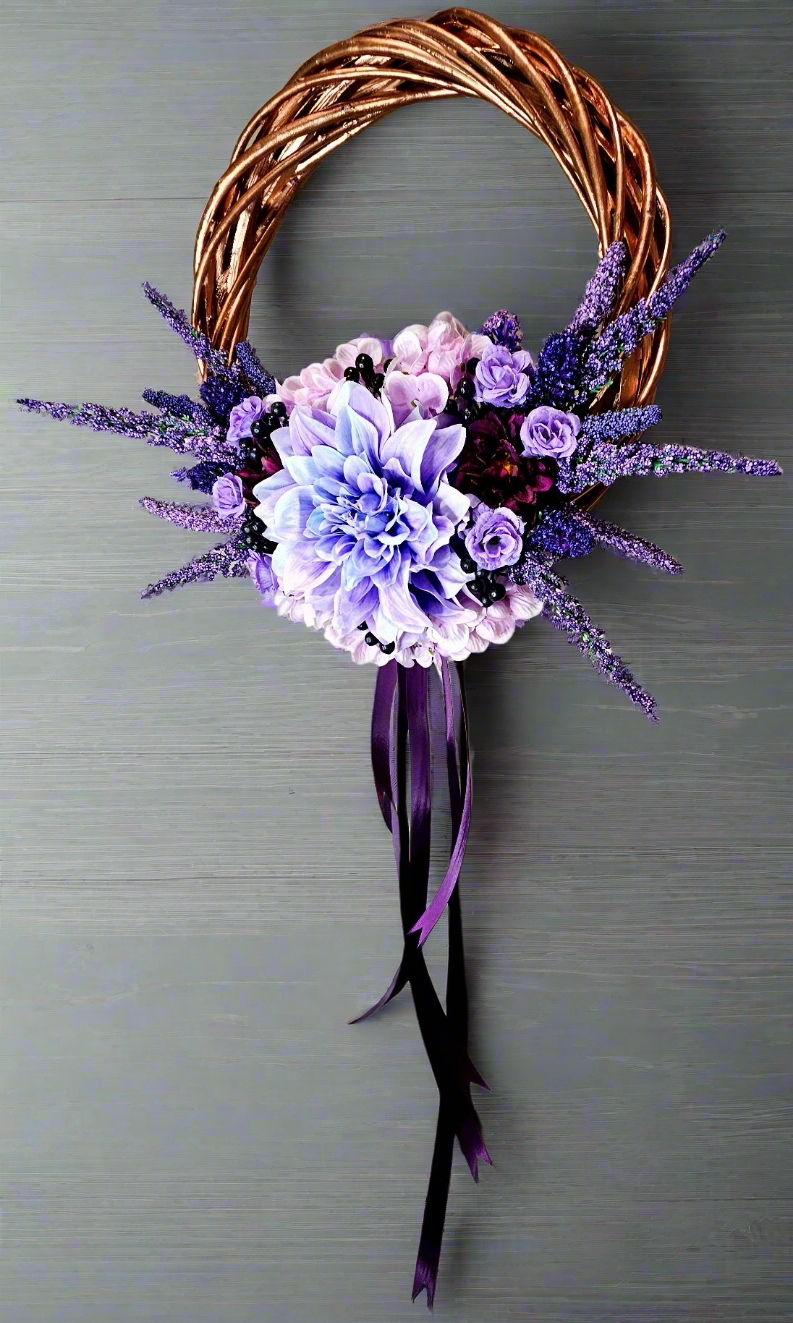 You'll never find a wreath quite like this one anywhere else! The Rose Gold metallic frame is the star of the show. A lush bouquet, in varying shades of purple, lies cradled at the base, while a sleek, dark purple satin ribbon hangs below, adding drama and volume to the piece.