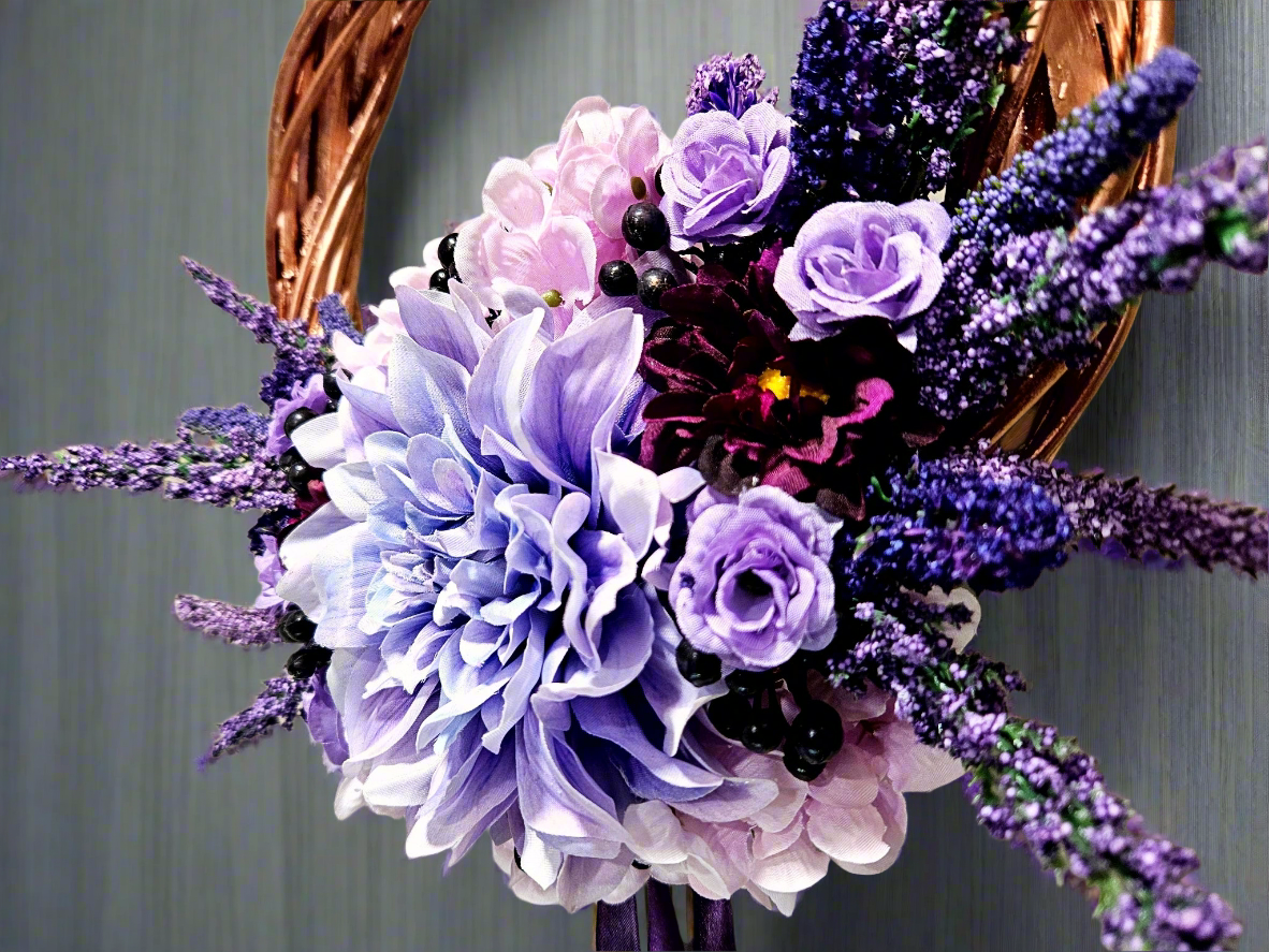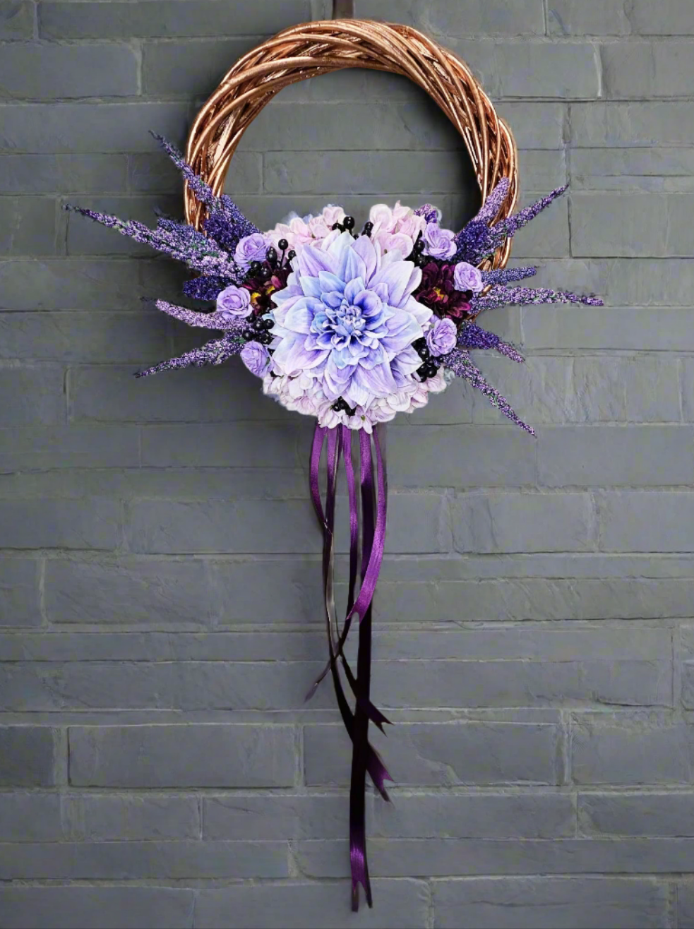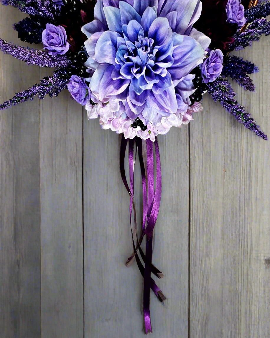 You'll never find a wreath quite like this one anywhere else! The Rose Gold metallic frame is the star of the show. A lush bouquet, in varying shades of purple, lies cradled at the base, while a sleek, dark purple satin ribbon hangs below, adding drama and volume to the piece.
