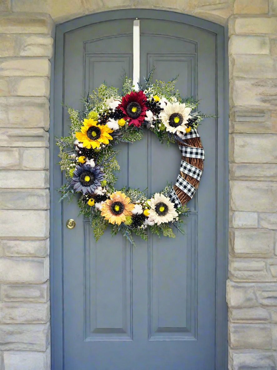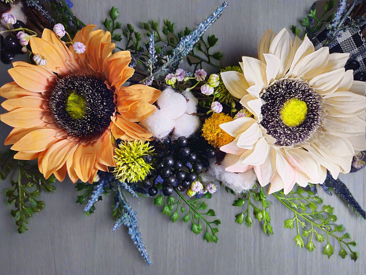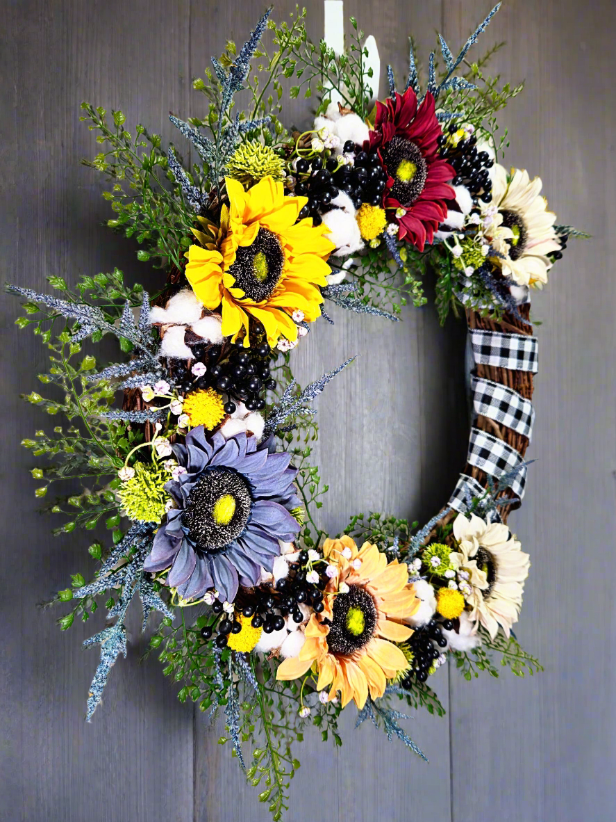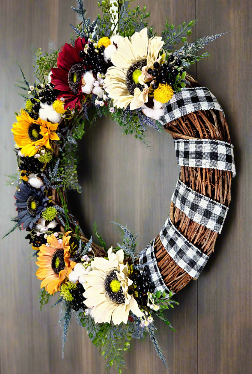 This demure sunflower wreath is ready to carry your home through the seasons! Six sunflowers, each of a different, unique color, line 3/4 of the grapevine frame. They are complimented by cotton tufts, black berry bundles, and mossy-colored greens. The other quarter of the frame boasts a contrasting buffalo plaid burlap ribbon.
