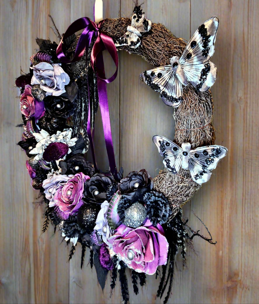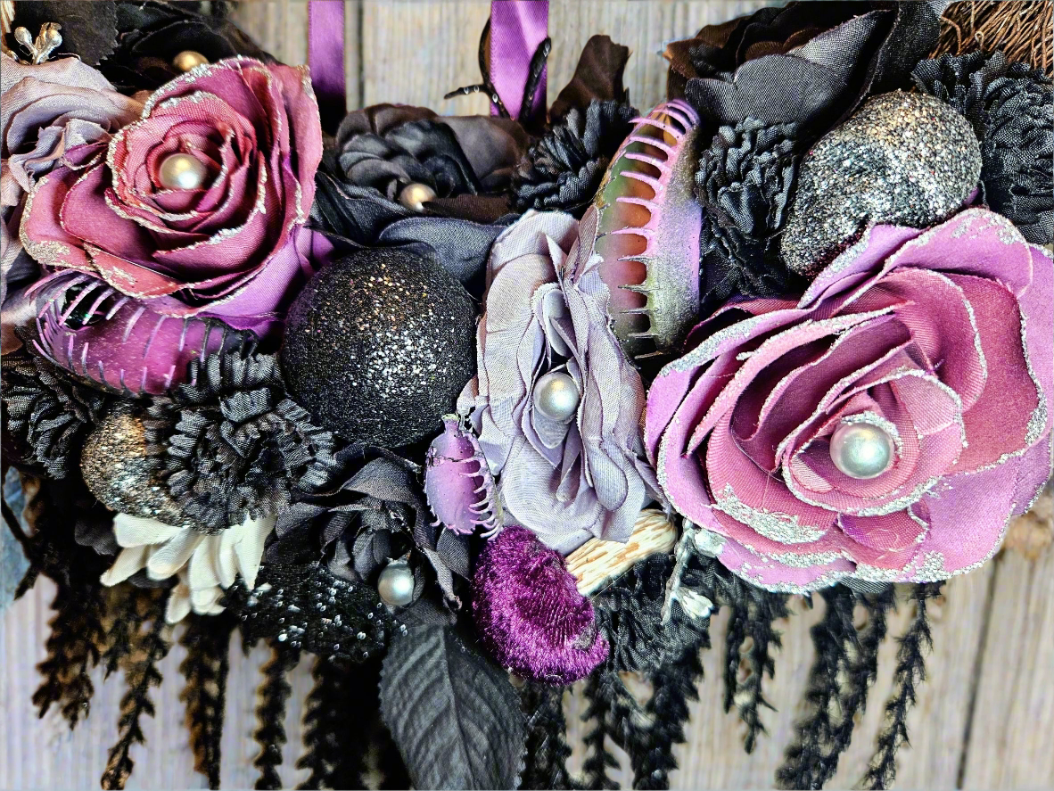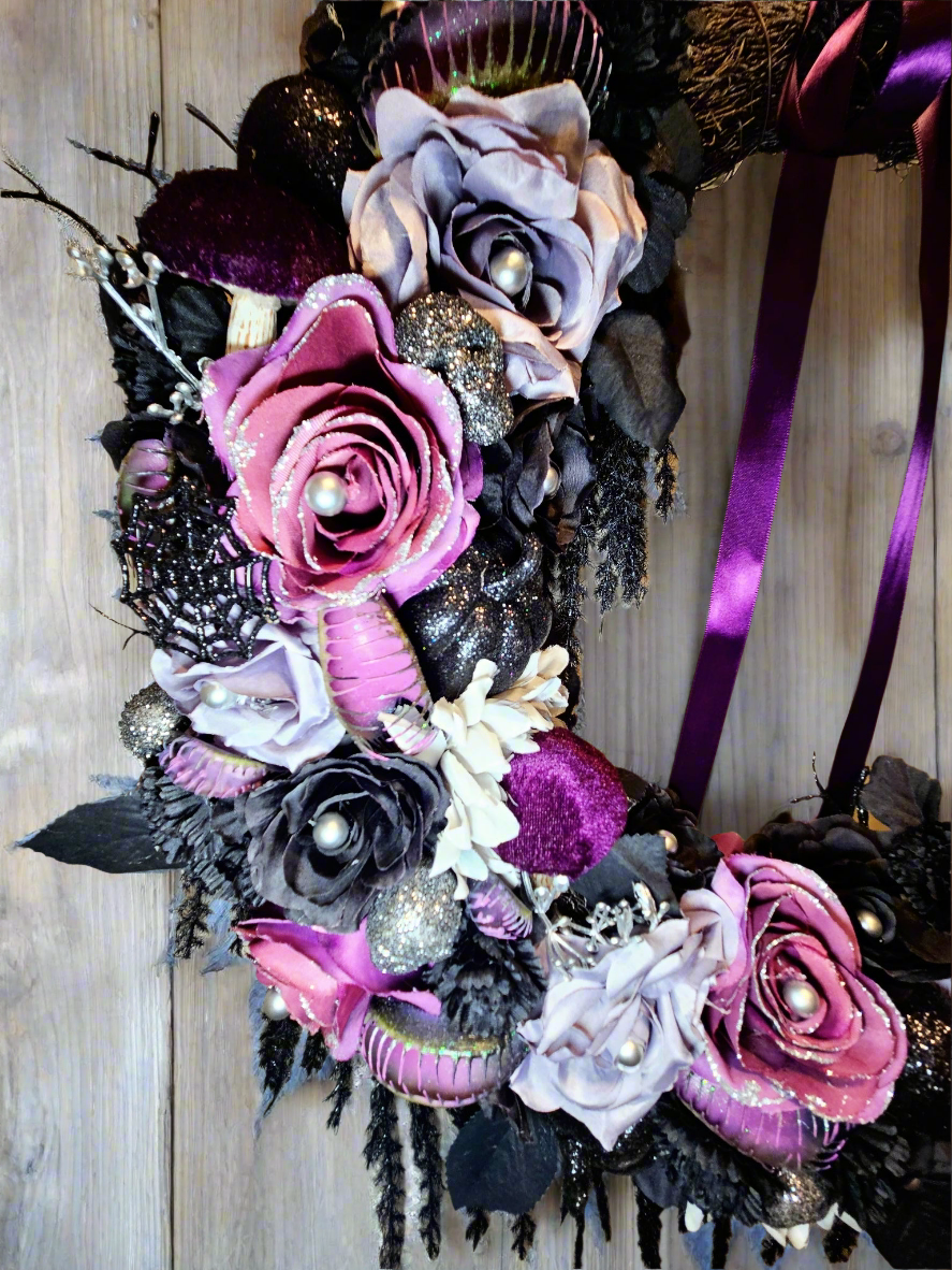 This Victorian beauty captures a classic Halloween vibe, with a subtle and romantic color pallette. A series of hungry Venus fly trap mouths hide among purple, black, and silver roses, waiting for their dinner. Glittering skulls, pumpkins, and spider webs add shine between the flowers, along with velvet flocked mushrooms. Black vines hang from the frame, a purple satin bow lays softly at the top, and stunning silver butterflies rest on the frame to complete the look.