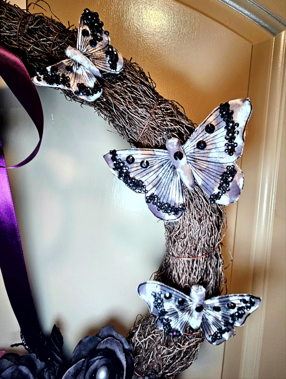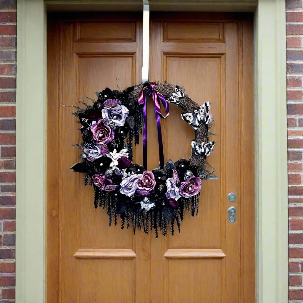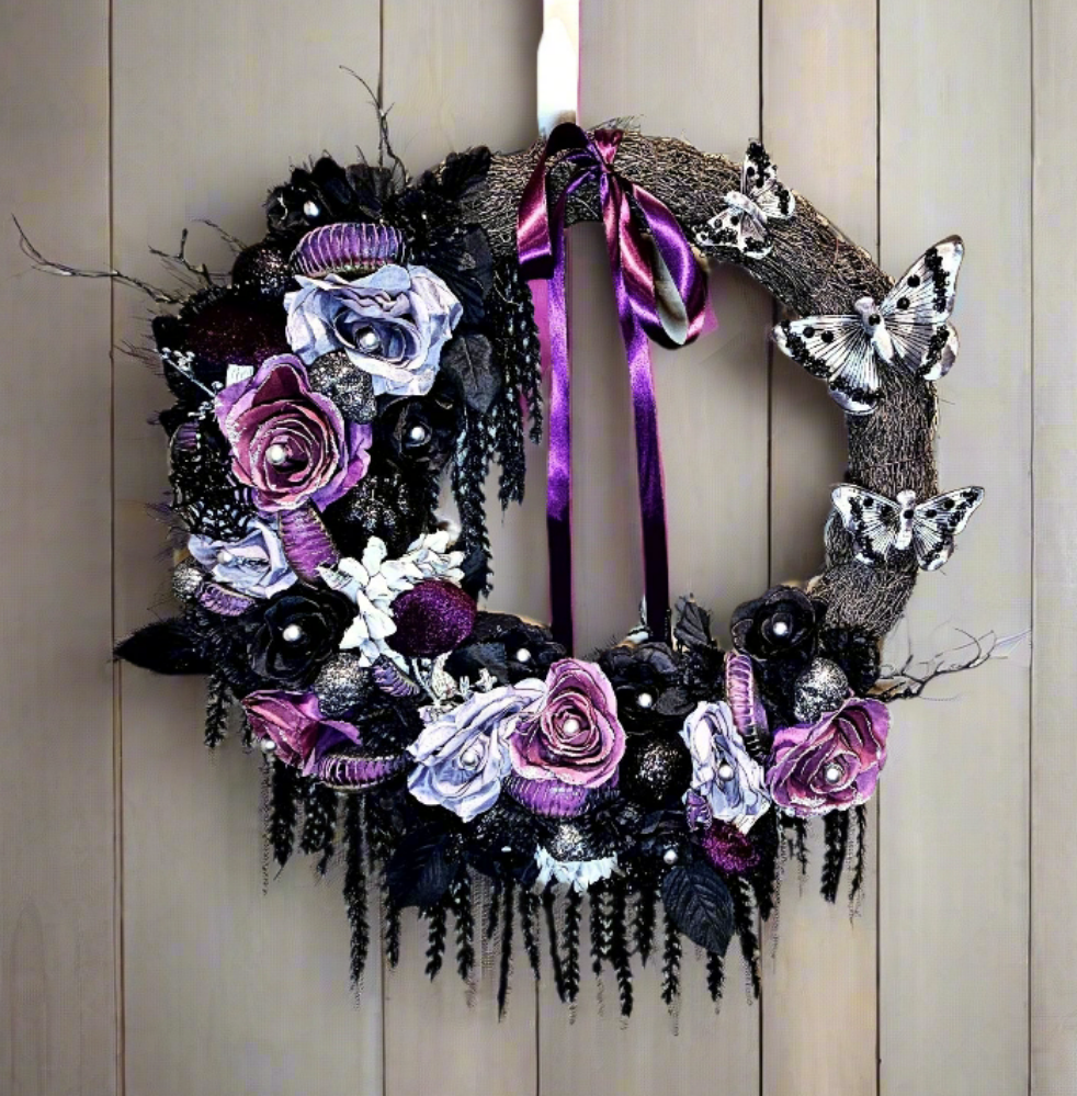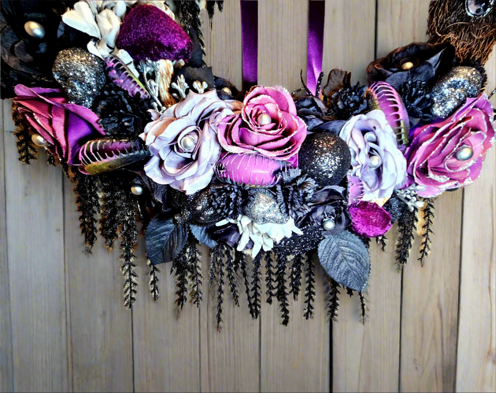 This Victorian beauty captures a classic Halloween vibe, with a subtle and romantic color pallette. A series of hungry Venus fly trap mouths hide among purple, black, and silver roses, waiting for their dinner. Glittering skulls, pumpkins, and spider webs add shine between the flowers, along with velvet flocked mushrooms. Black vines hang from the frame, a purple satin bow lays softly at the top, and stunning silver butterflies rest on the frame to complete the look.