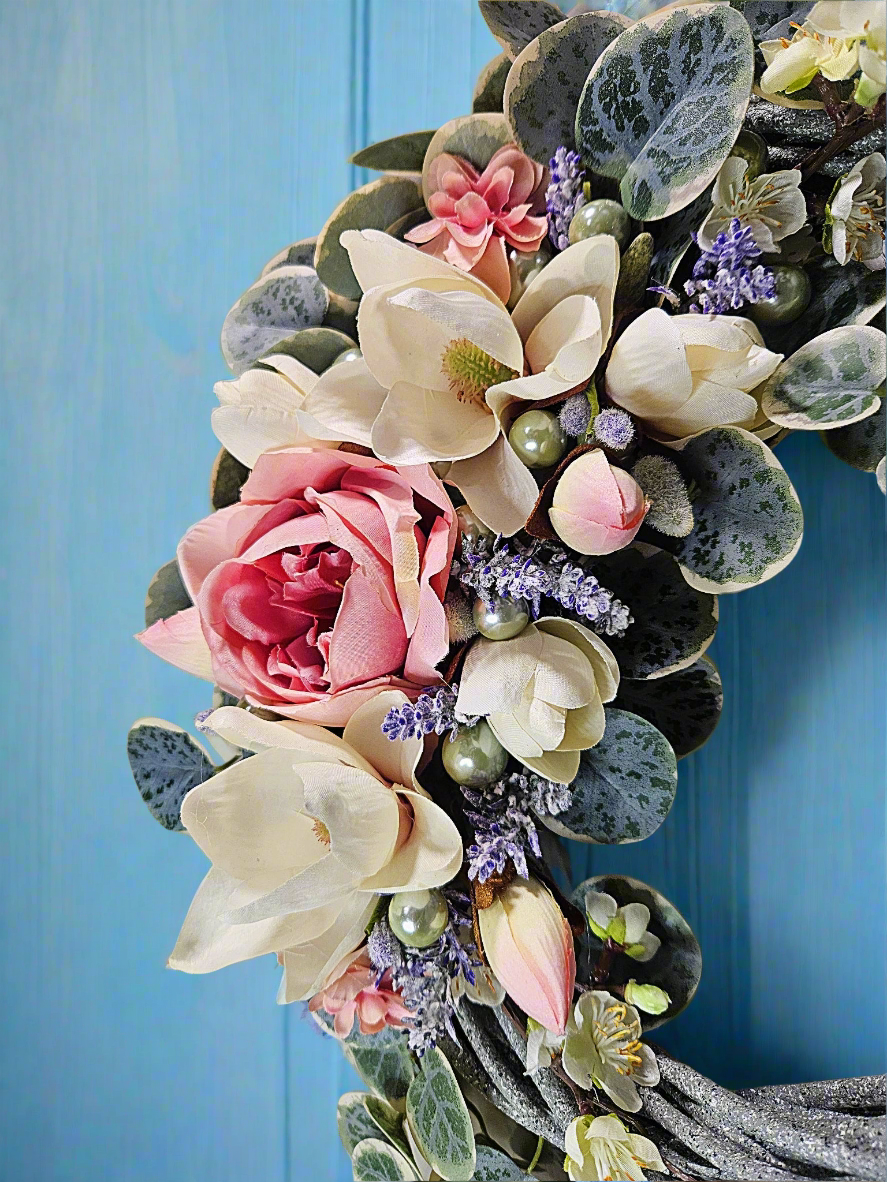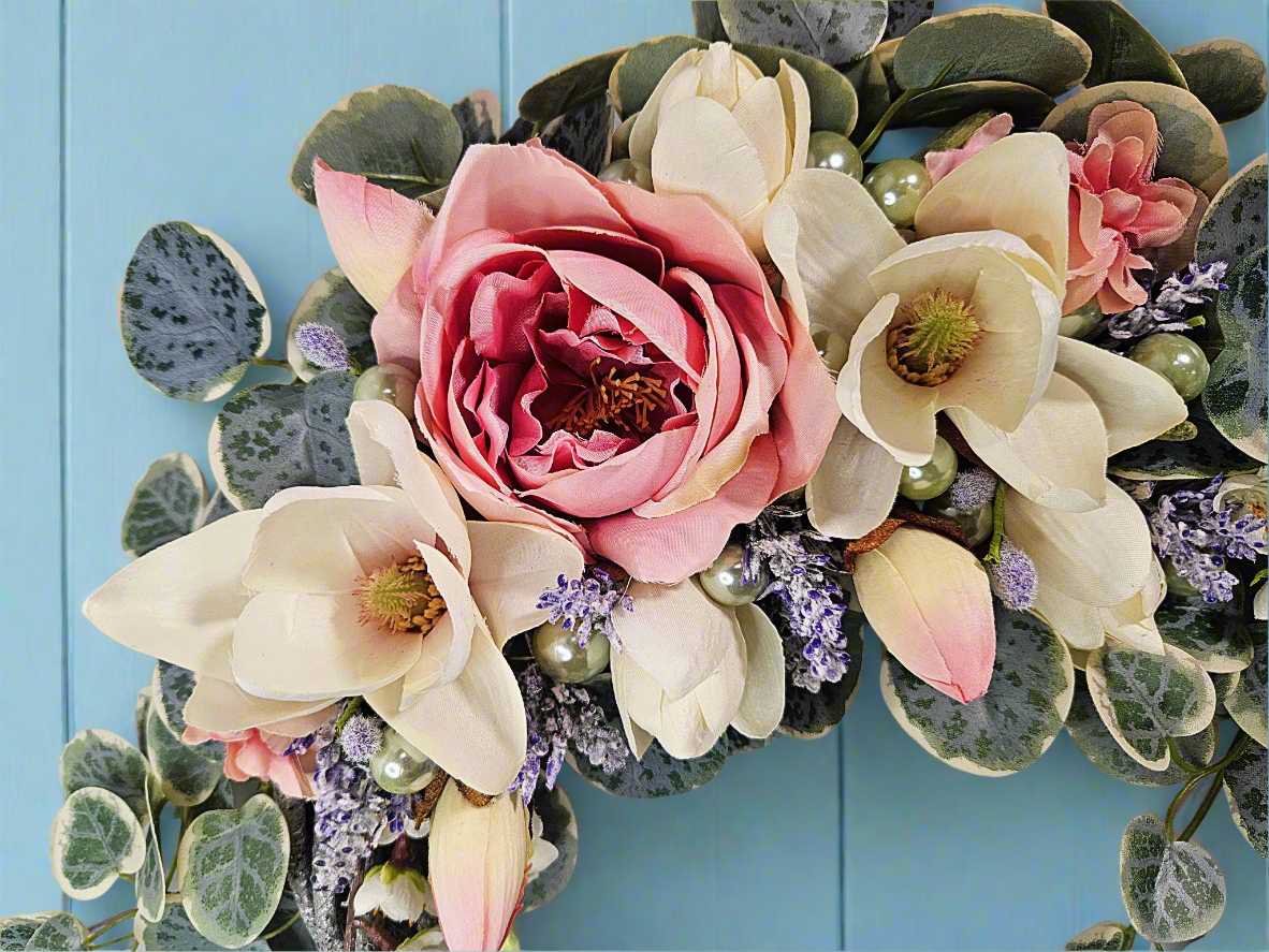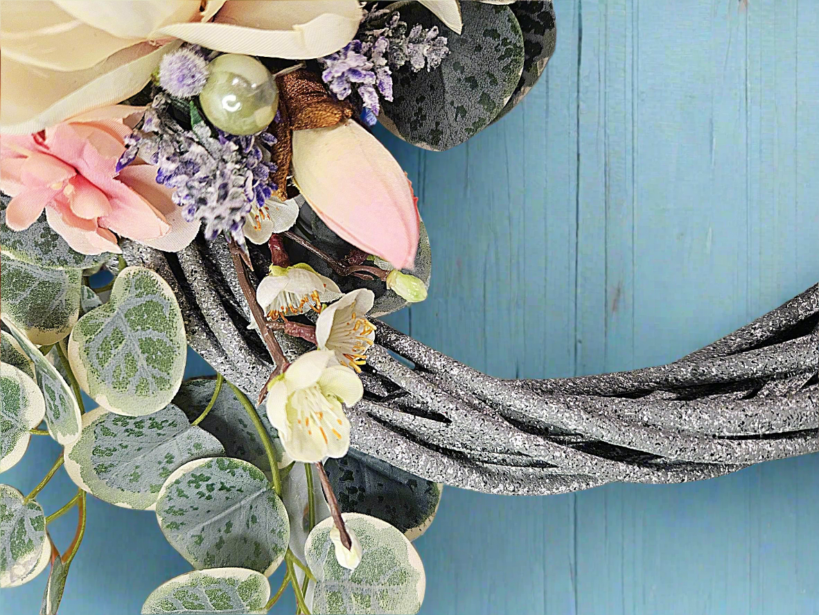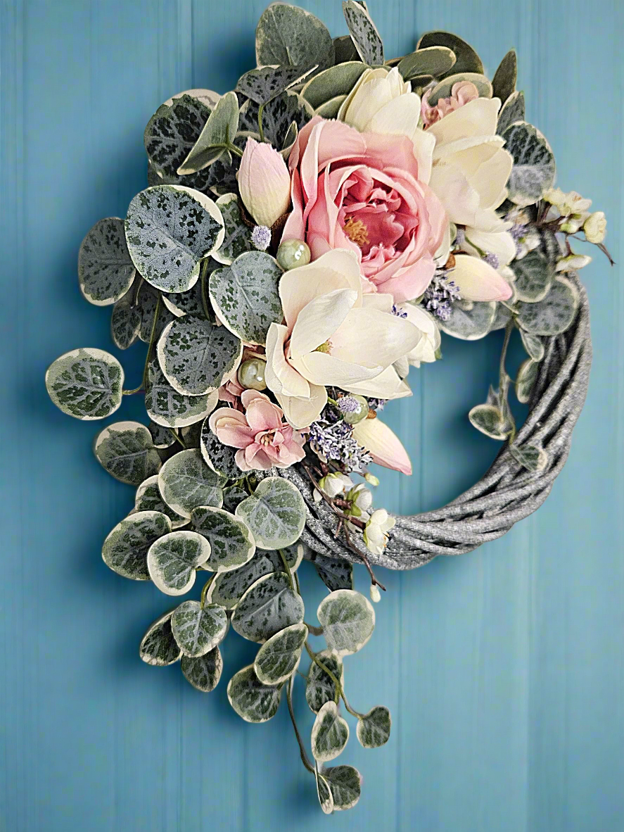 This wreath is the perfect decor you've been looking for to complete your zen space. A texturized faux-stone frame serves as the unique base. Soft blush and cream flowers are accented by hints of purple and soft gray pussy willows. Green pearlescent beads add a subtle shine, as eacalyptus vines cascade down around it.