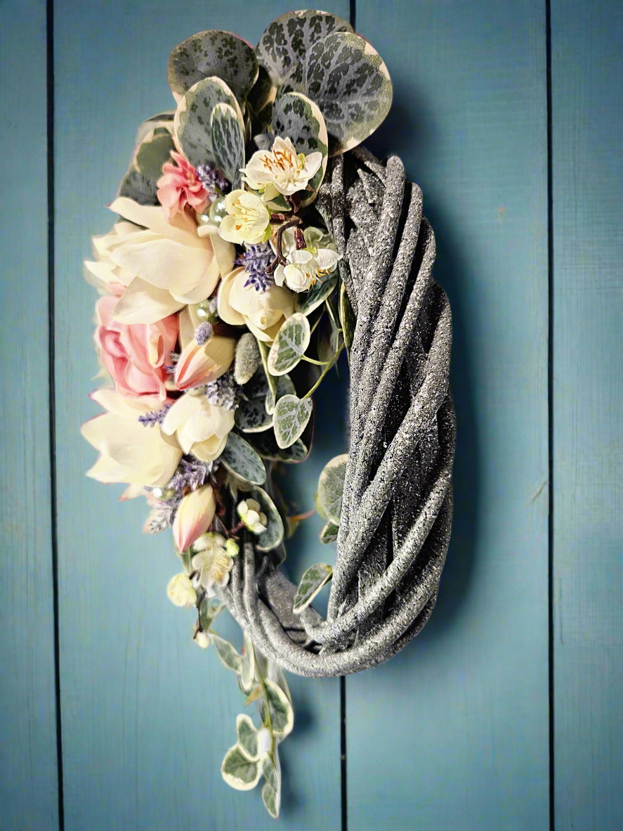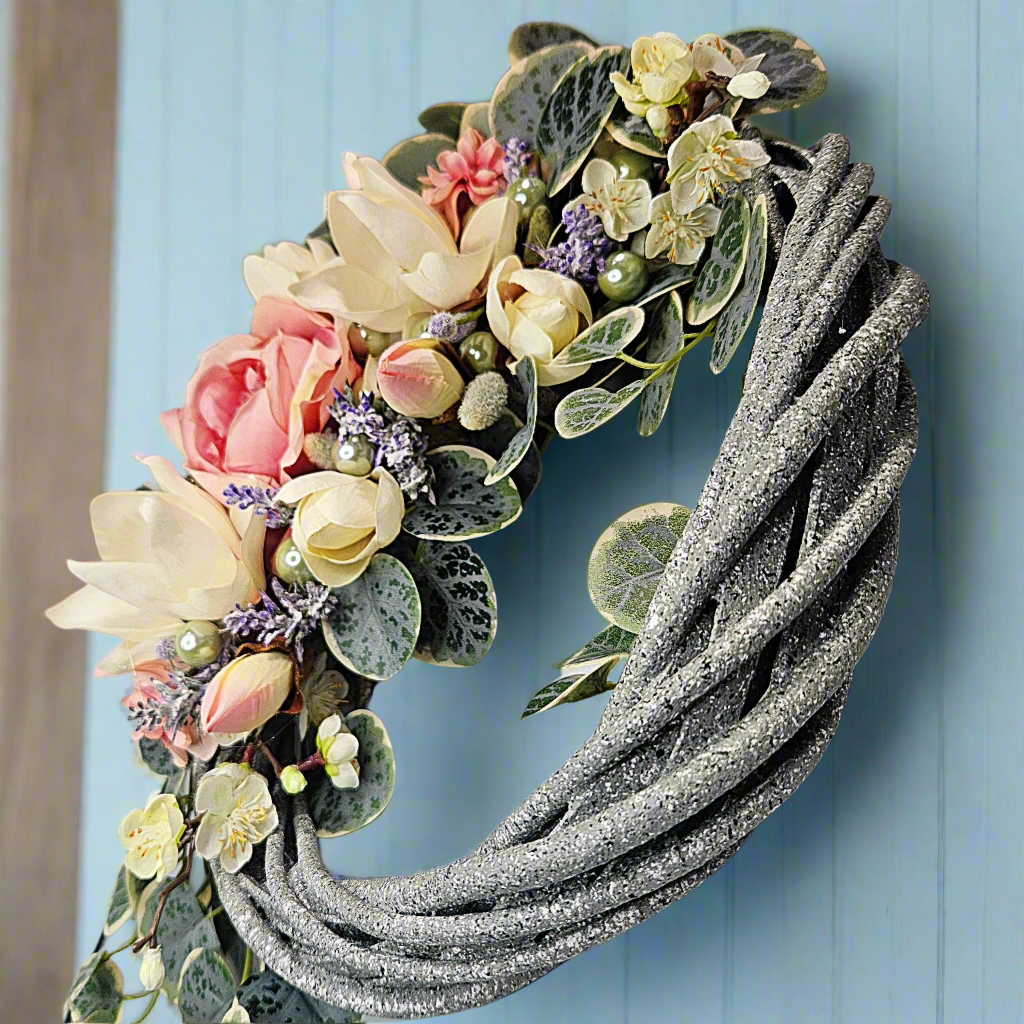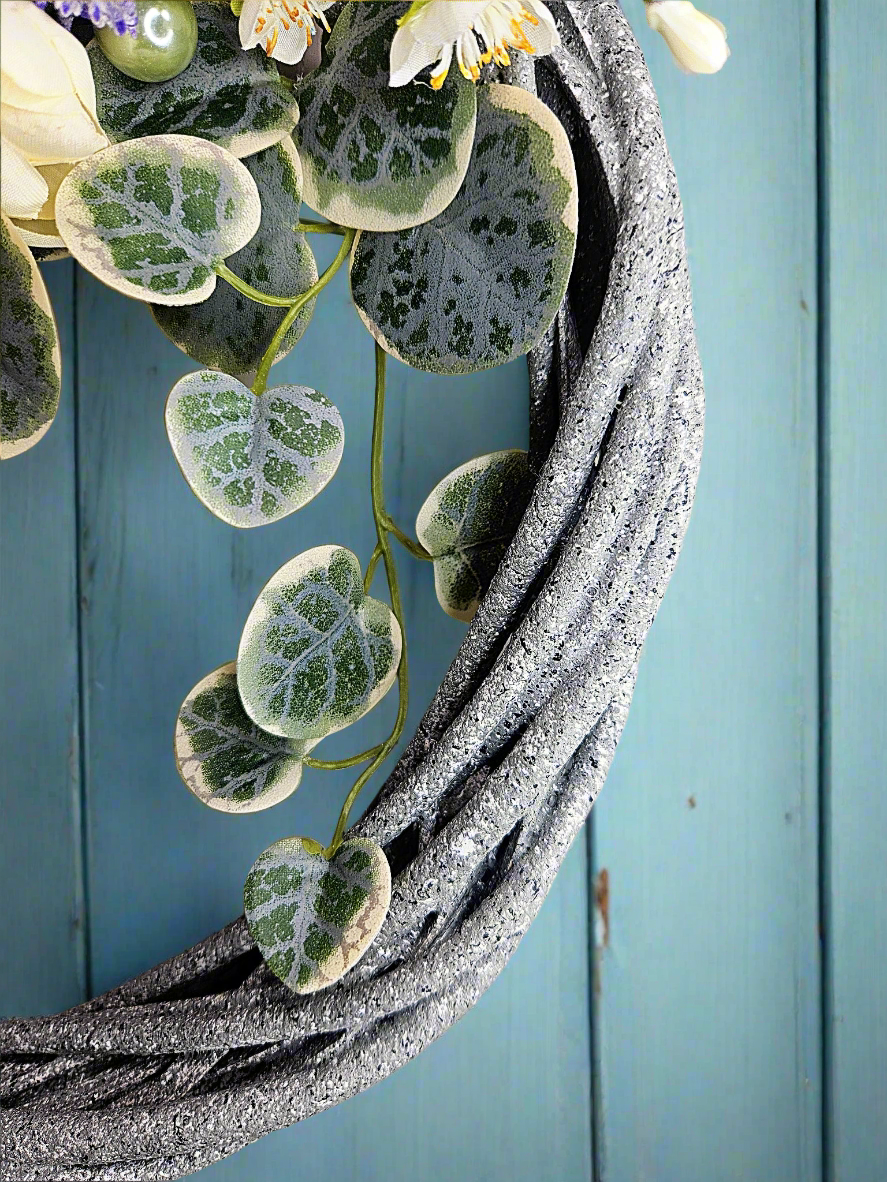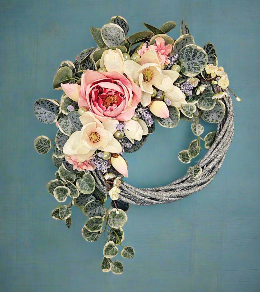 This wreath is the perfect decor you've been looking for to complete your zen space. A texturized faux-stone frame serves as the unique base. Soft blush and cream flowers are accented by hints of purple and soft gray pussy willows. Green pearlescent beads add a subtle shine, as eacalyptus vines cascade down around it.